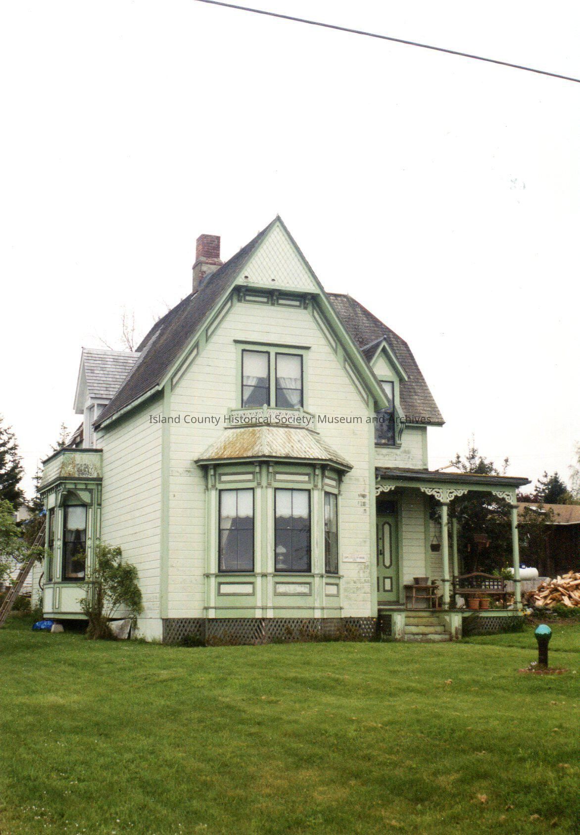 "Clapp" written in blue biro on back. Front exterior shot of Clapp House. Partial view of left side (from viewer's pov). Pale green painted and trim in darker green. Some of the green paint has flaked off above the bay window.