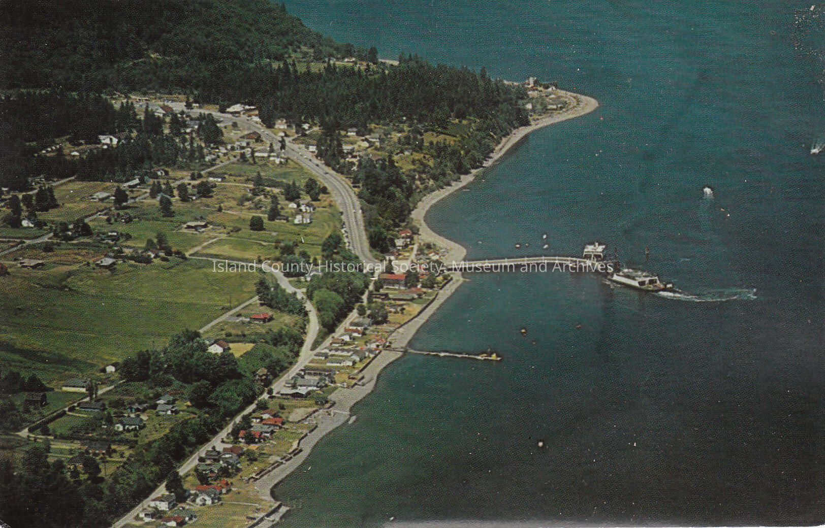 Columbia Beach, Whidbey Island. Color postcard. Aerial view of harbor, wharf and ferry docking at the wharf.Made/Created