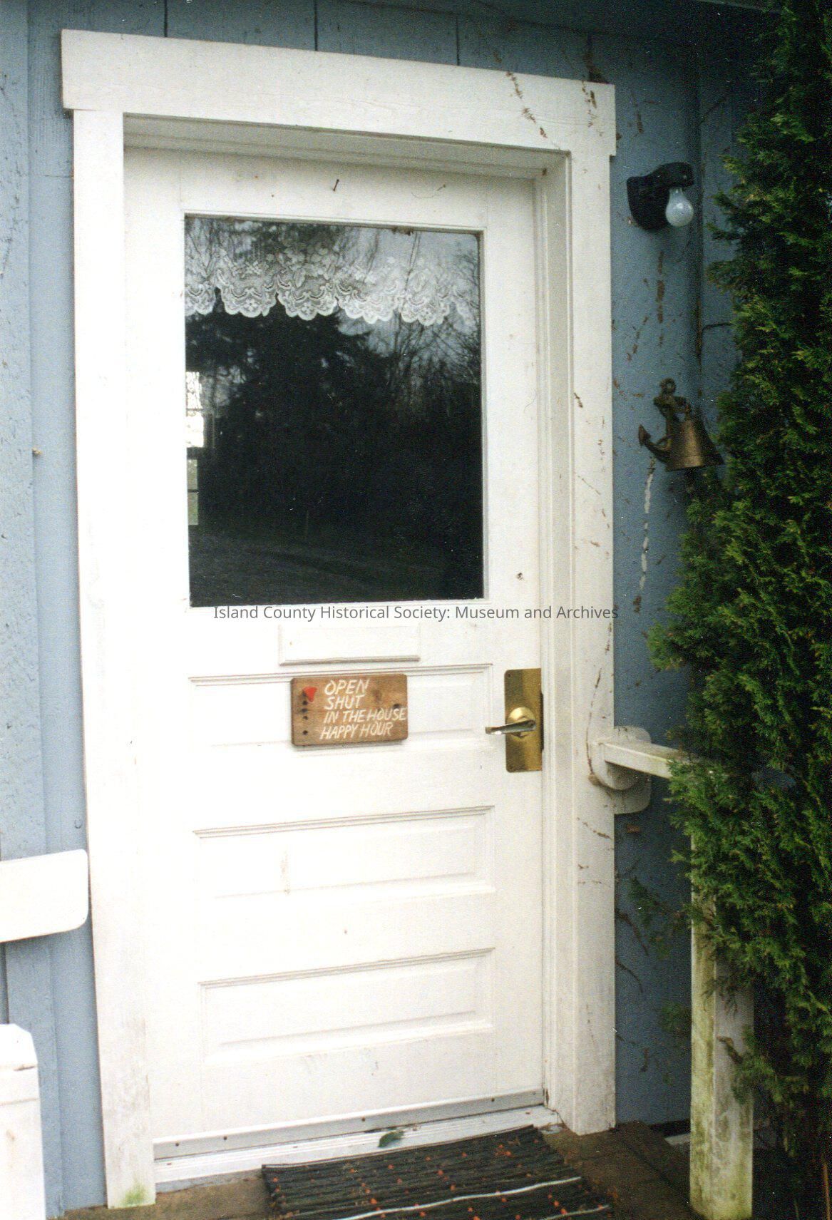 Close up of a Holbrook house door with sign on it saying, "Open Shut In the house happy hour".