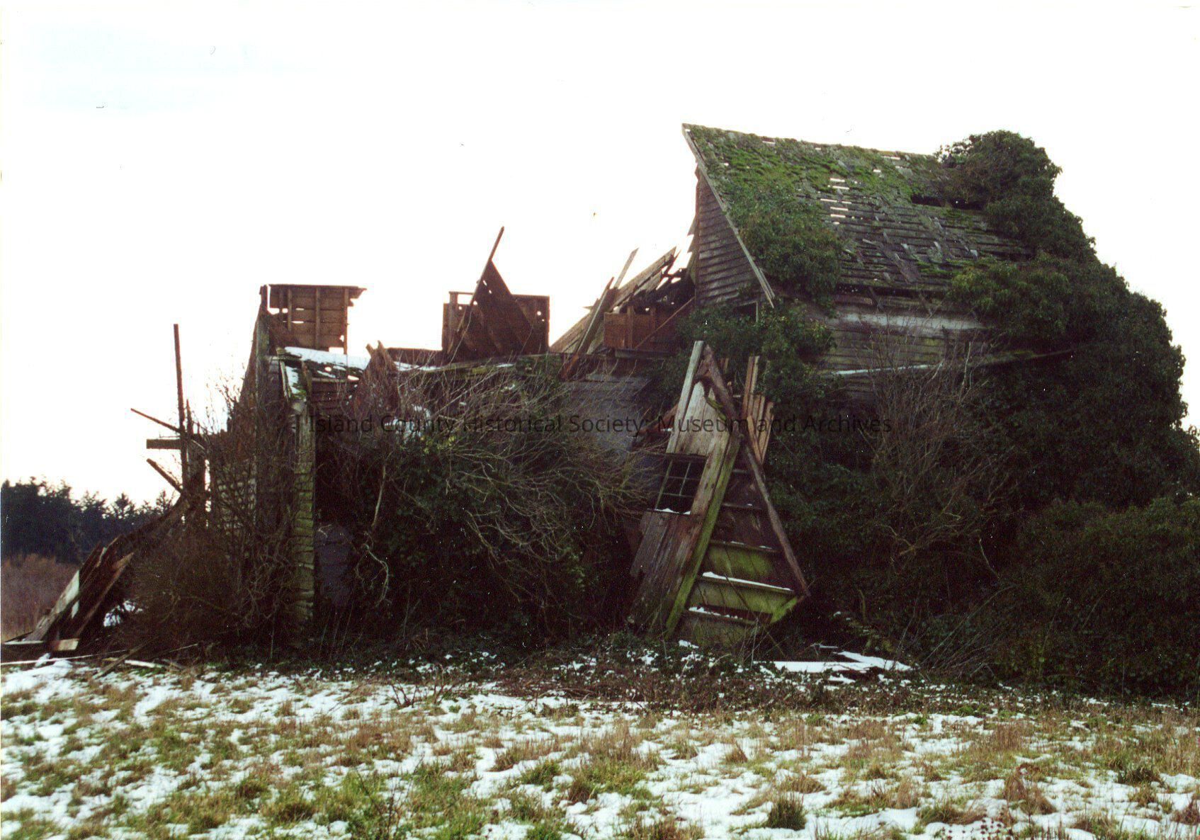 Grove C Terry house exterior shot (on Burchell Road). Covered in shrubbery. Wreckage.