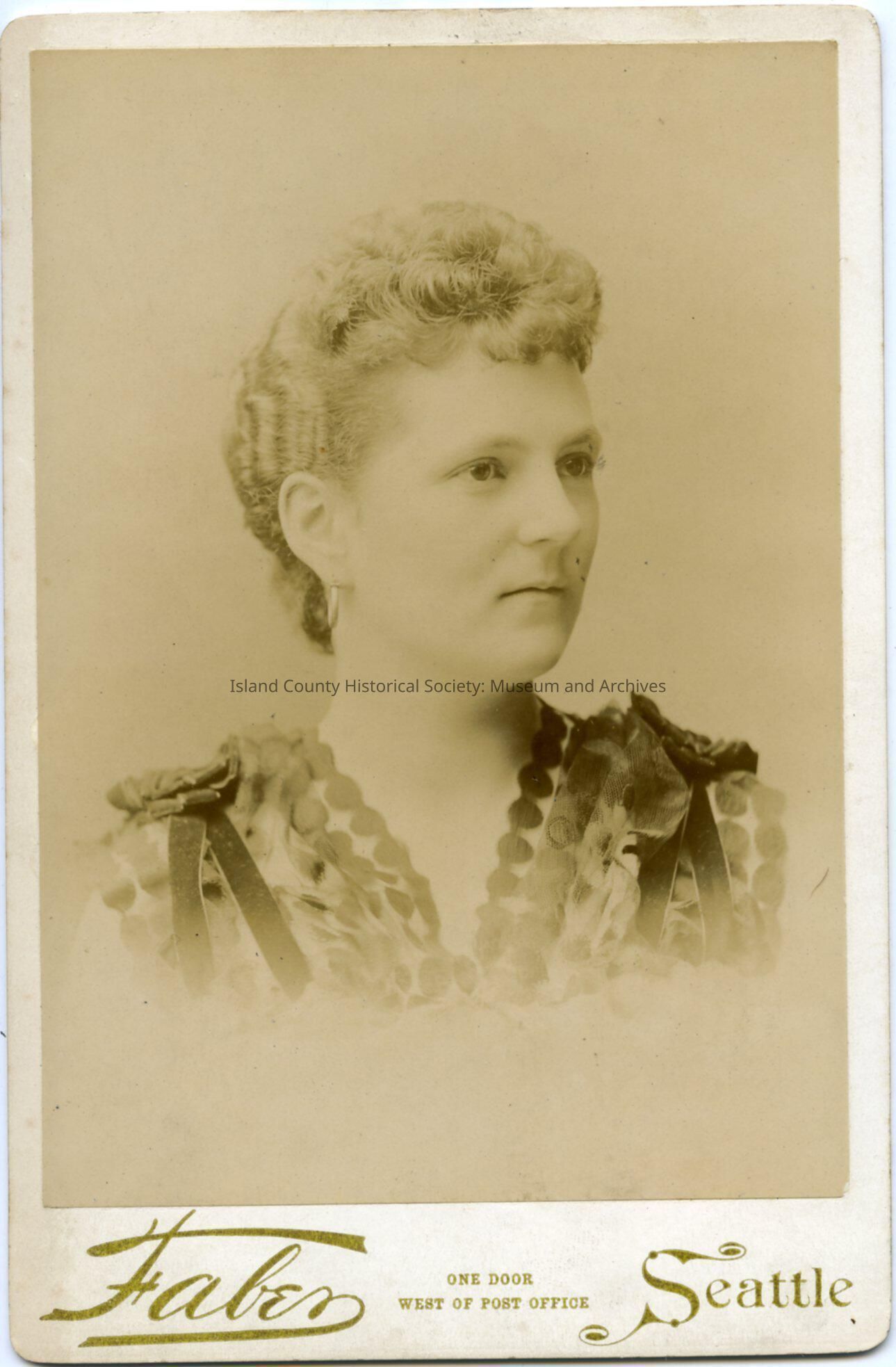 A photo portrait of Flo Cranney Lovejoy. She is facing to her left, has curly hair. her dress/top has ribbons at her shoulders and a design with small circles or dots up and down in rows.