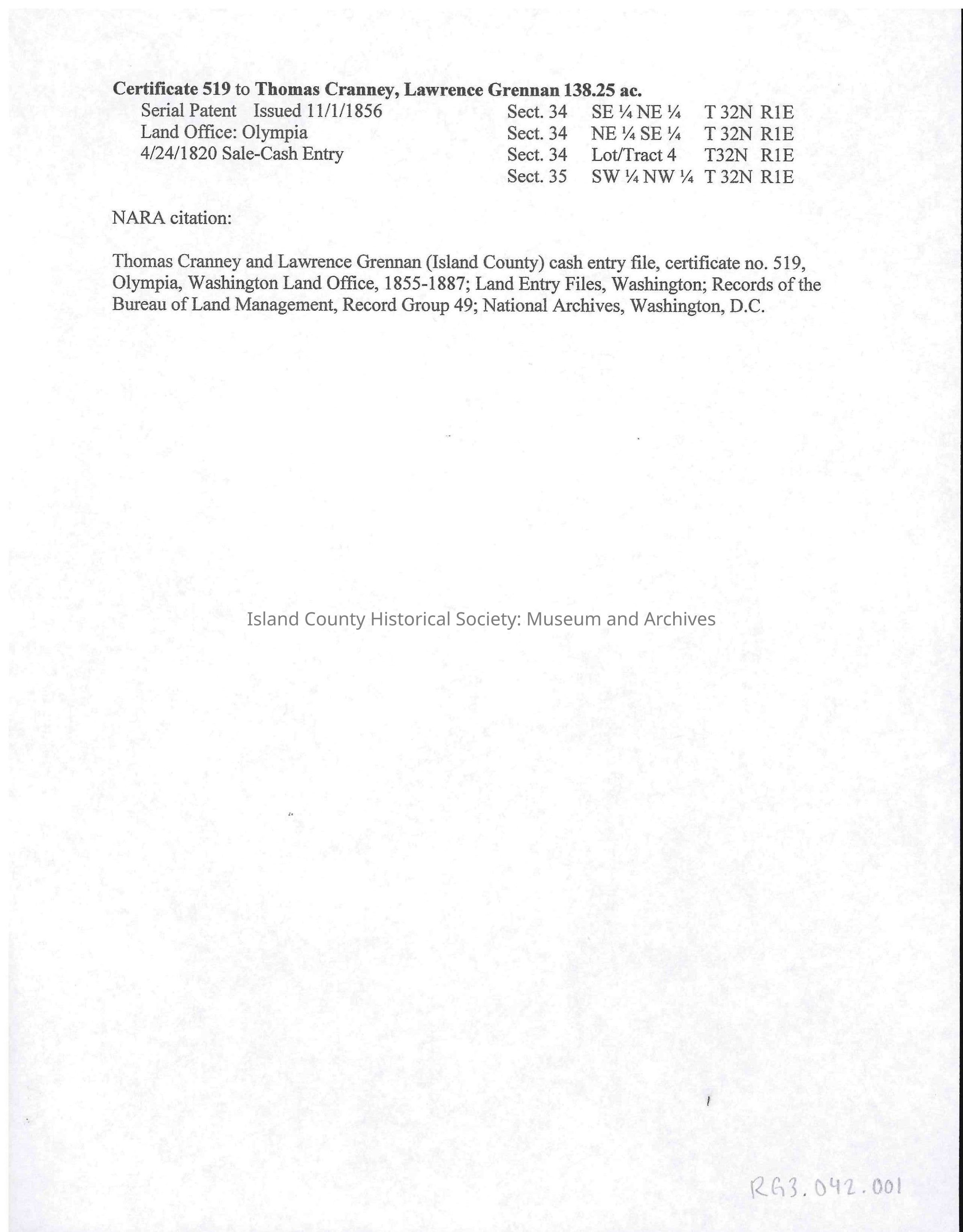 Typed sheet describing Certificate 519 To Thomas Cranney, Lawrence Grennan, containing cash entries for land in Island County. Contains a National Archives (NARA) description.Collection