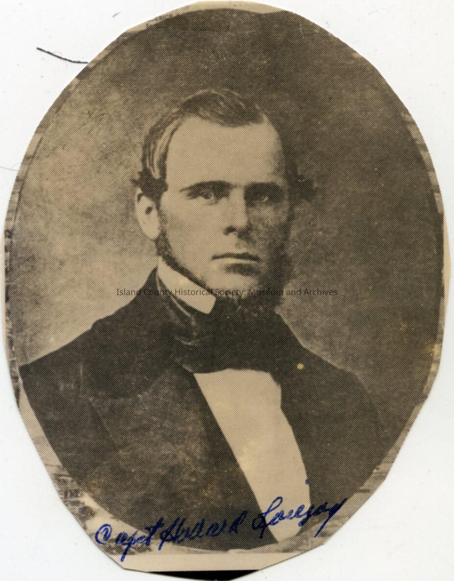 A small oval photo portrait of Captain Howard Lovejoy. He is wearing a suit with wide lapels on the jacket, a high collar shirt, large cravat or tie. He has whiskers and beard but no mustache.