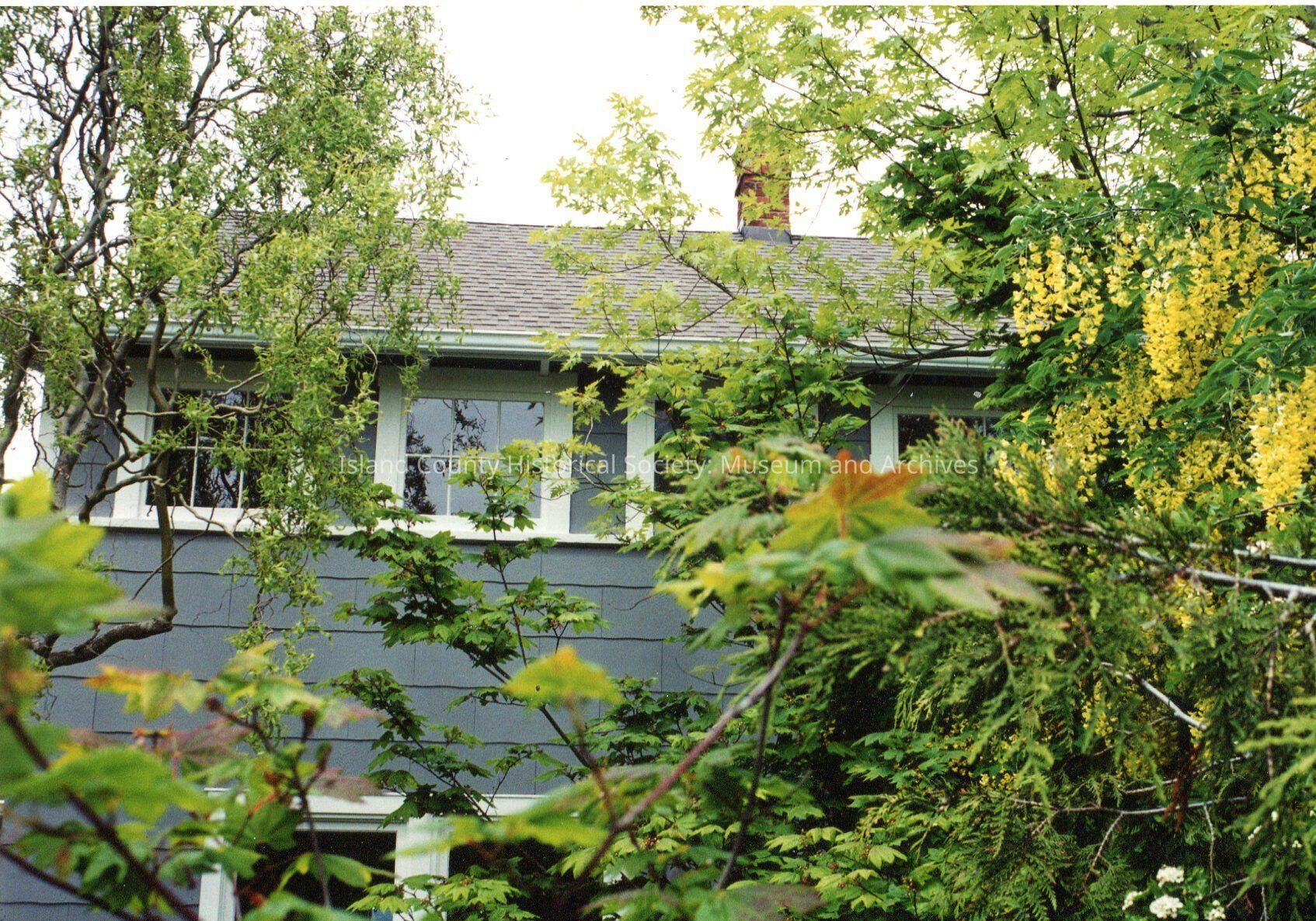 Horace Holbrook house exterior shot, close-up of side mostly obscured by leaves