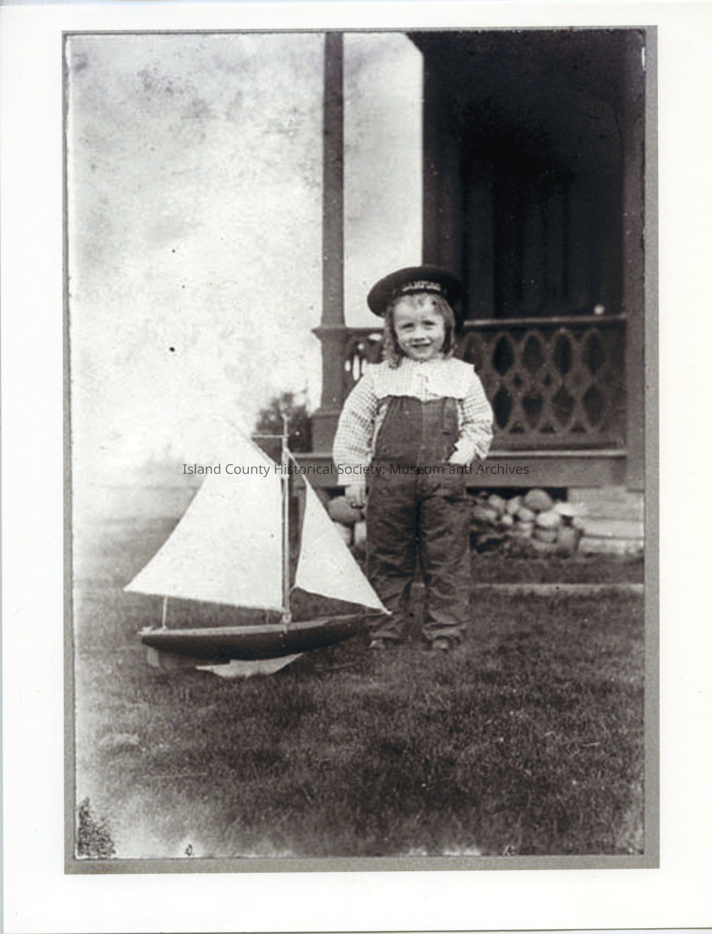The document that accompanies the photo: Oliver S. Van Olinda Photographs Item and Description. Stanley Lovejoy with toy sailboat, Coupeville, Whidbey Island, 1900.Made/Created