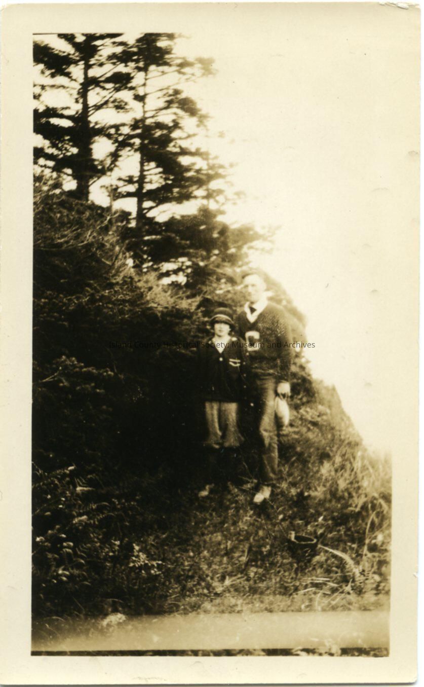 A photo of a man and a woman standing on a hilside with trees in the background. The woman is wearing trousers, a hat and a large cardigan. The man is wearing a v-neck sweater with the letter C in the middle, and trousers; he is holding a cap in his left hand.