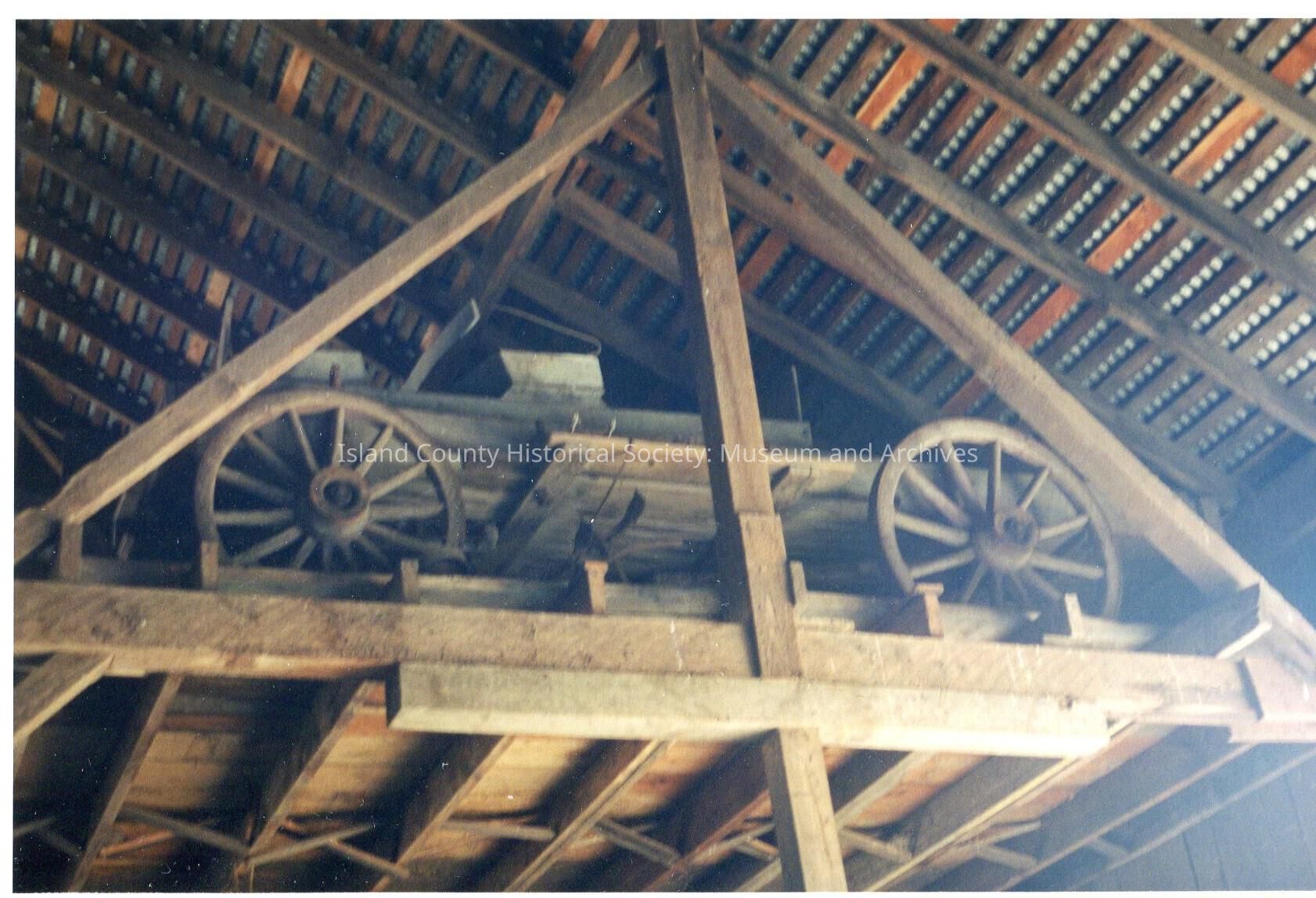 Smith Barn interior. Wagon/cart/other wheeled vehicle made of wood sitting in the rafters of the barn.