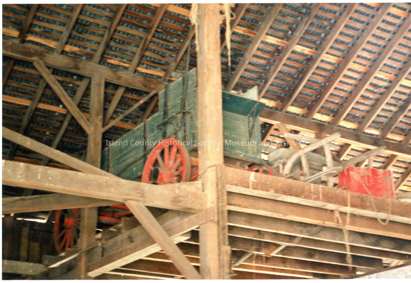 Smith Barn interior. Wagon/cart/other wheeled vehicle made of wood (red painted wheels, green body) sitting in the rafters of the barn. Image is blurry but perhaps a sled or something similar also up there.