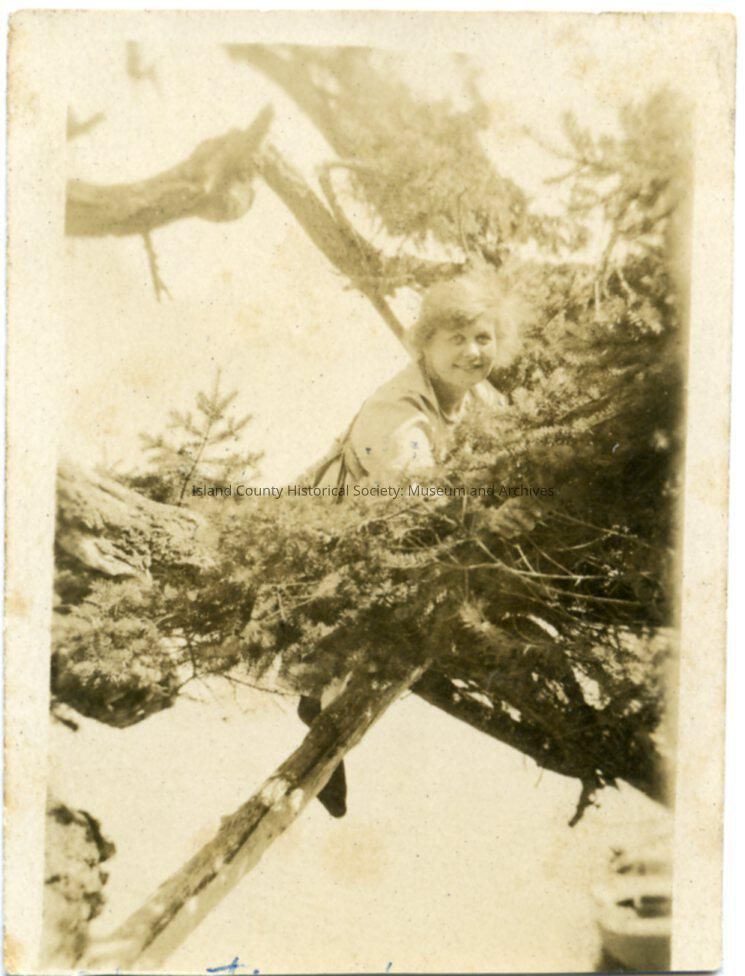 Photo of a young girl in a tree. Looks like she climbed up a limb or pole dangling at an angle beneath her. Looks like snow on the ground. Looks like a boat in the lower right corner. On the back: Louise Malstrom.
