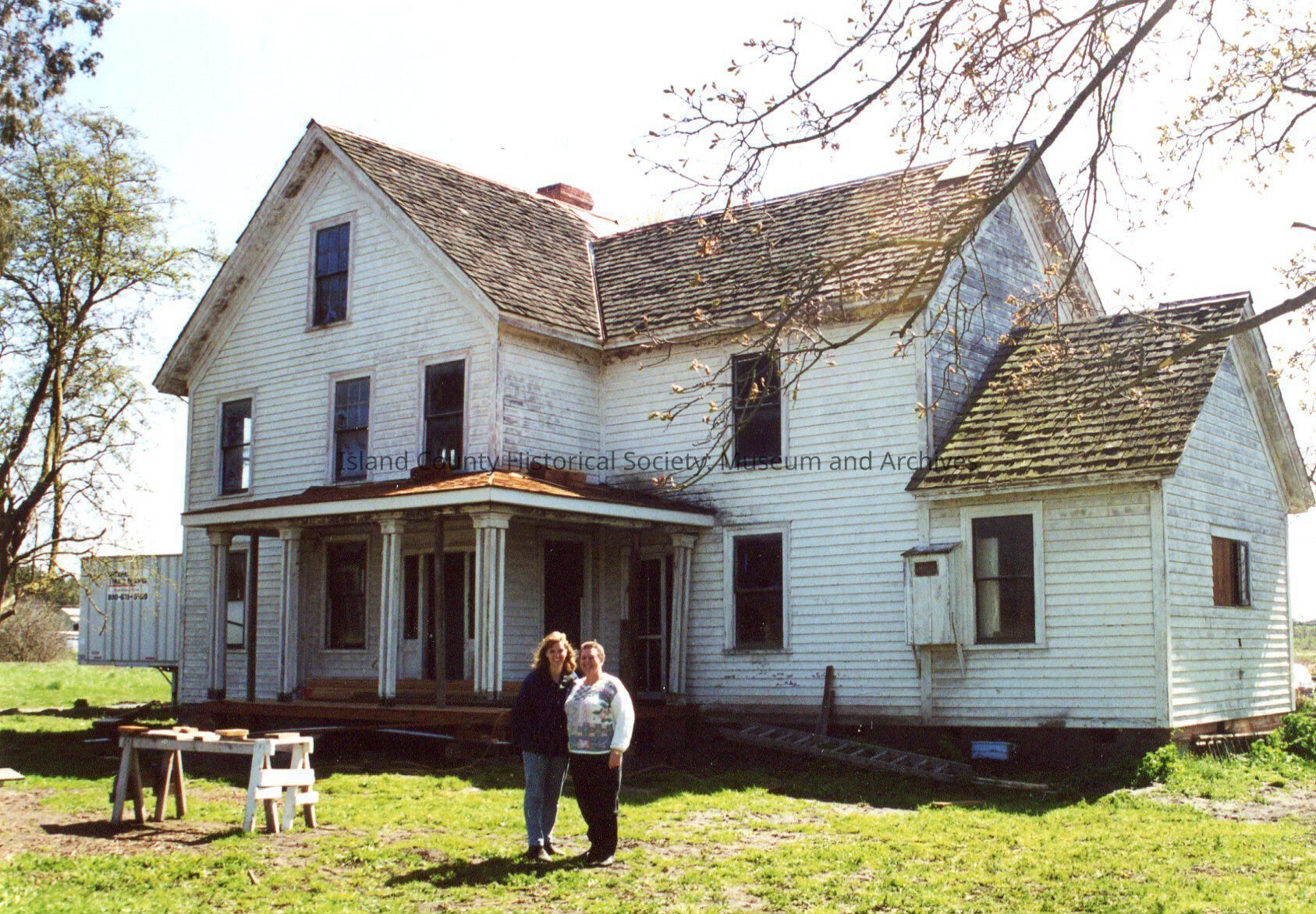 John Crockett House exterior. Two women standing together posing for camera outside house front. Workbench to the viewer's left.