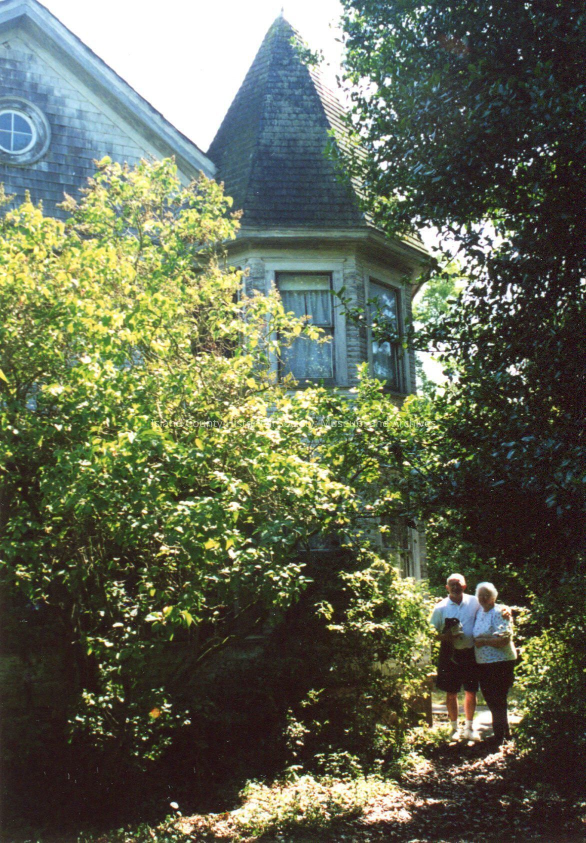 Pearson Engle House, close-up of turret with a man and woman with dog posing for camera on left side of photo, framed by arching foliage.