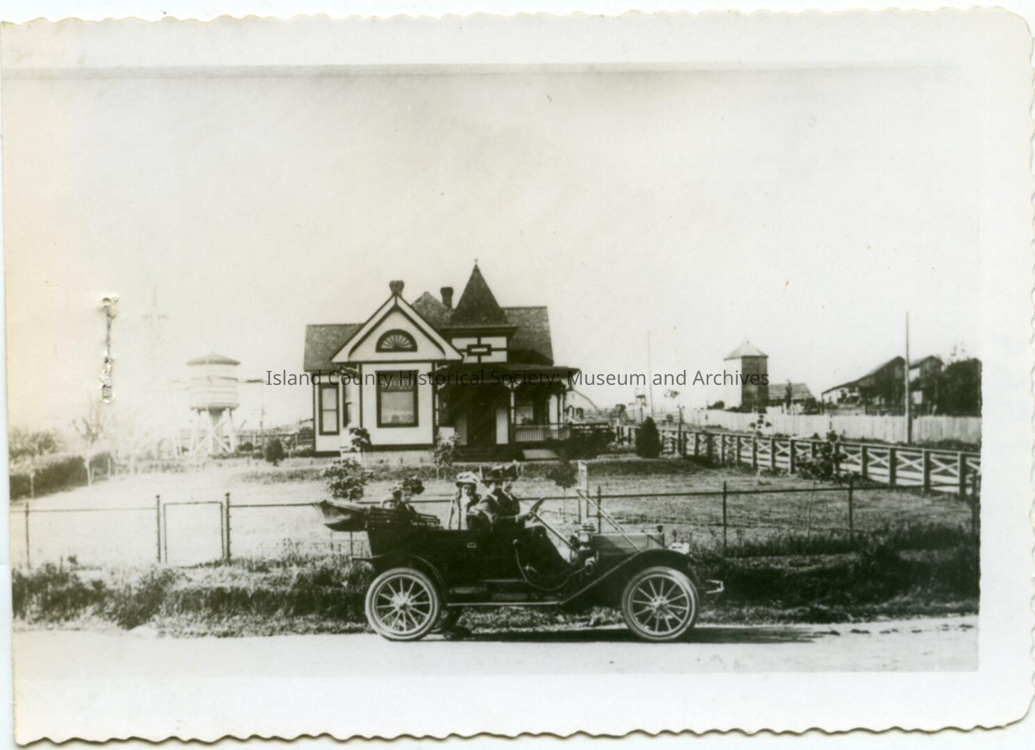 They lived in Oak Harbor. The house is two-story, gables, chimneys and porches. A water tower is to the left of the house (as we look at the photo). A fence and barn/farm buildings on each side.