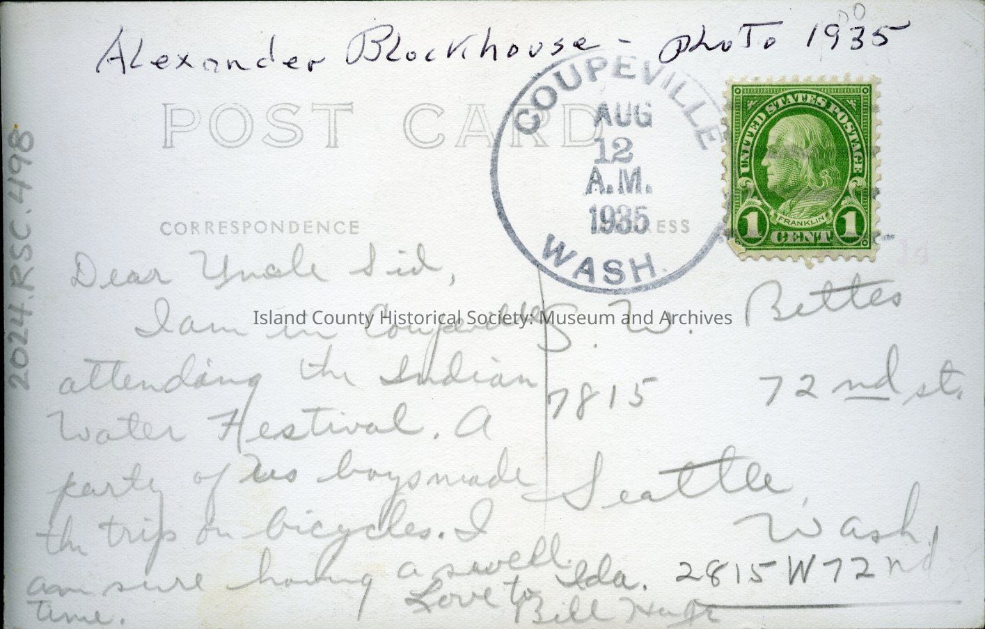 Postcard depicting Alexander Blockhouse. Reverse reads, "Dear Uncle Sid, I am in Coupeville attending the Indian Water Festival. A party of us boys made the trip on bicycles. I am sure having a swell time. Love to Ida. Bill Hage" Addressed to S.W. Bettes, 7815 72nd Street, Seattle Wash., 2815 West 72nd. Postmarked 12 August 1935, Coupeville, Washington. Photo c. 1935.Collection