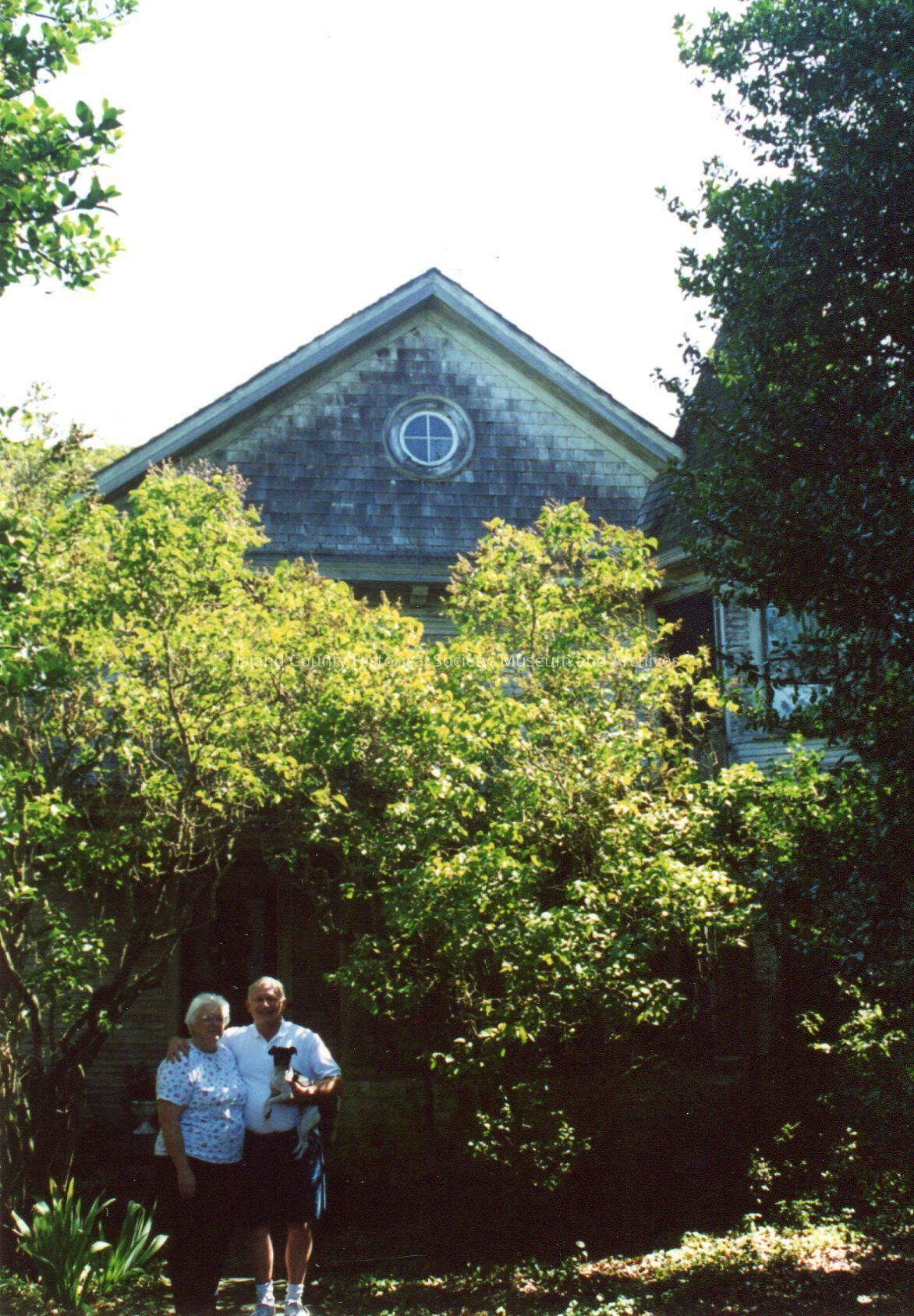 Harmon/Engle House -front view with older couple posing outside, tree foliage pbscuring most of the building front exterior