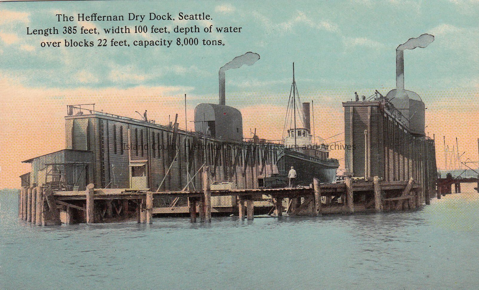 The Heffernan Dry Dock, Seattle. Length 385 feet, width 100 feet, depth of water over blocks 22 feet, capacity 8,000 tonsEntry/Object ID