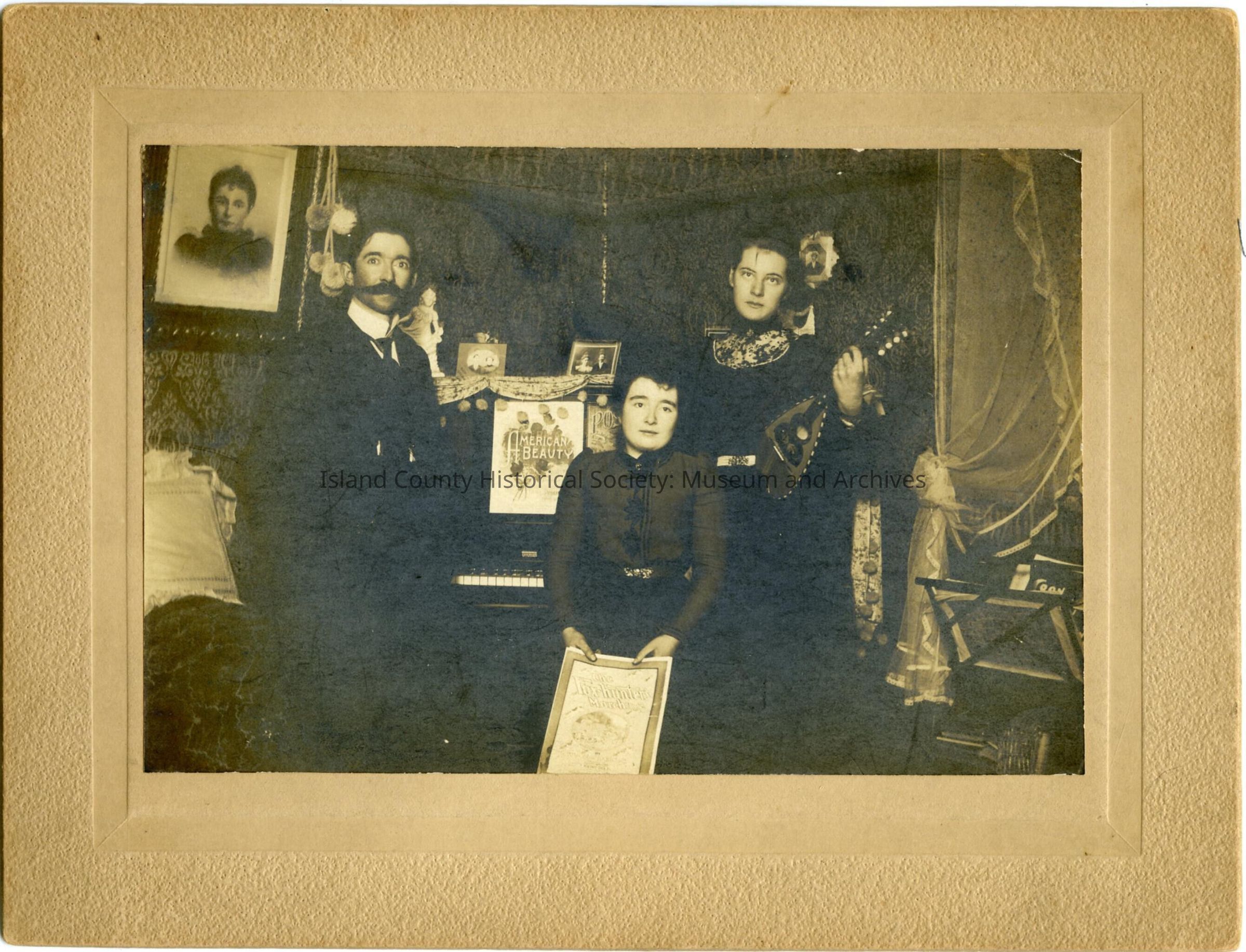 Photo two young women and a young man in probably a "parlor" of a house. They are in front of a piano (music of American Beauty). THe young woman with a lace collar is holding a mandolin. He is wearing a suit. He has a mustache. The women are wearing dresses - and don't look happier about being photographed than in 2019.012.024. The photo is mounted on cardboard. This photo is dated May 1901 but they are all wearing the same clothes.
