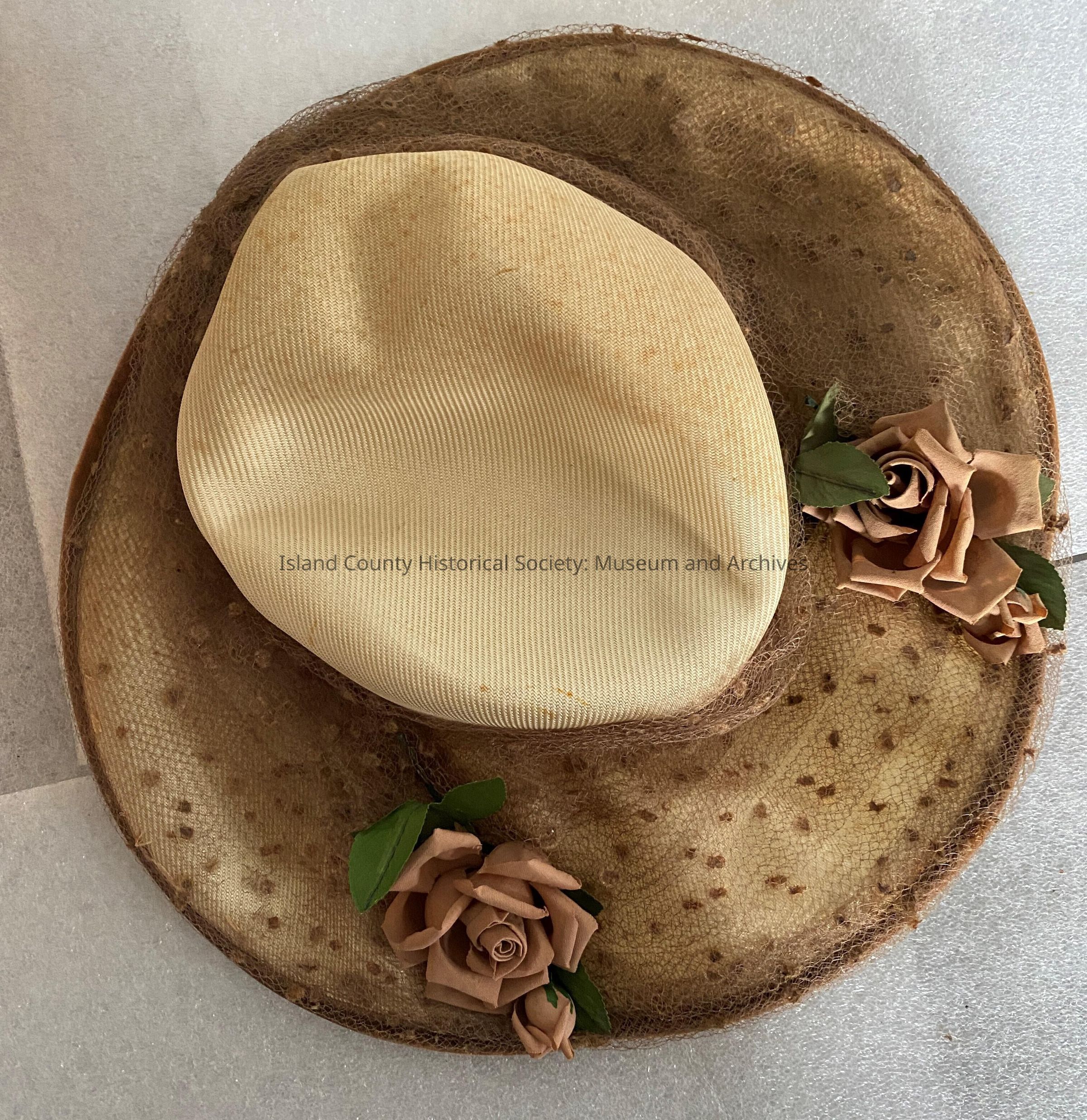 A cream hat with brown lace overlay and faux pink roses having belonged to Flora Augusta Pearson EngleCollection