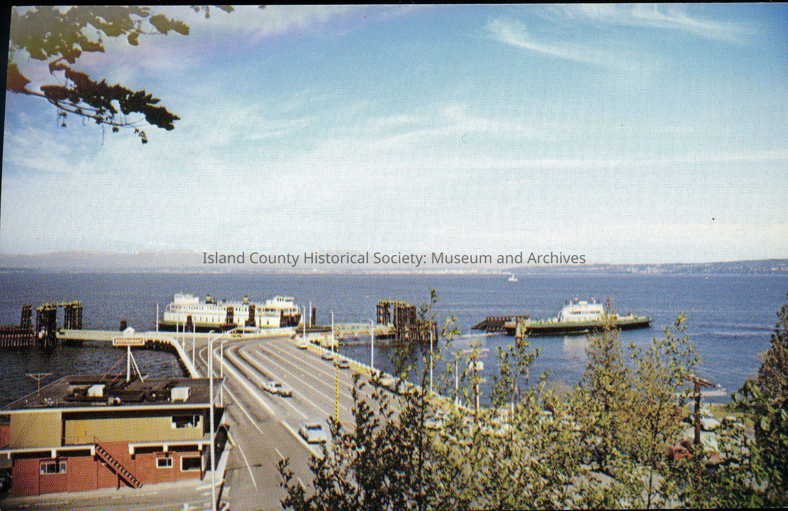 Postcard of Washington State Ferry "Kulshan" leaving "Whidby" Island from Clinton, c. 1960s. Descriptive text on reverse of postcard reads, "A Washington State Ferry leaves Whidby Island from the Columbia Beach Landing at Clinton, Washington -- bound for Mukilteo on the mainland. Another is moored at the dock, awaiting service." Photo by Fred Shaw.Collection