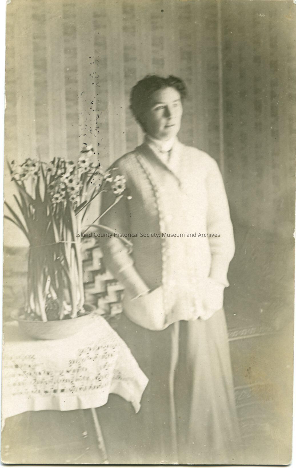Postcard of an unidentified Maylor girl. She is wearing a long v-necked swater with pockets in the front; her hands are in the pockets. She is standing beside a table with a tablecloth, and a shallow pot of daffodils.