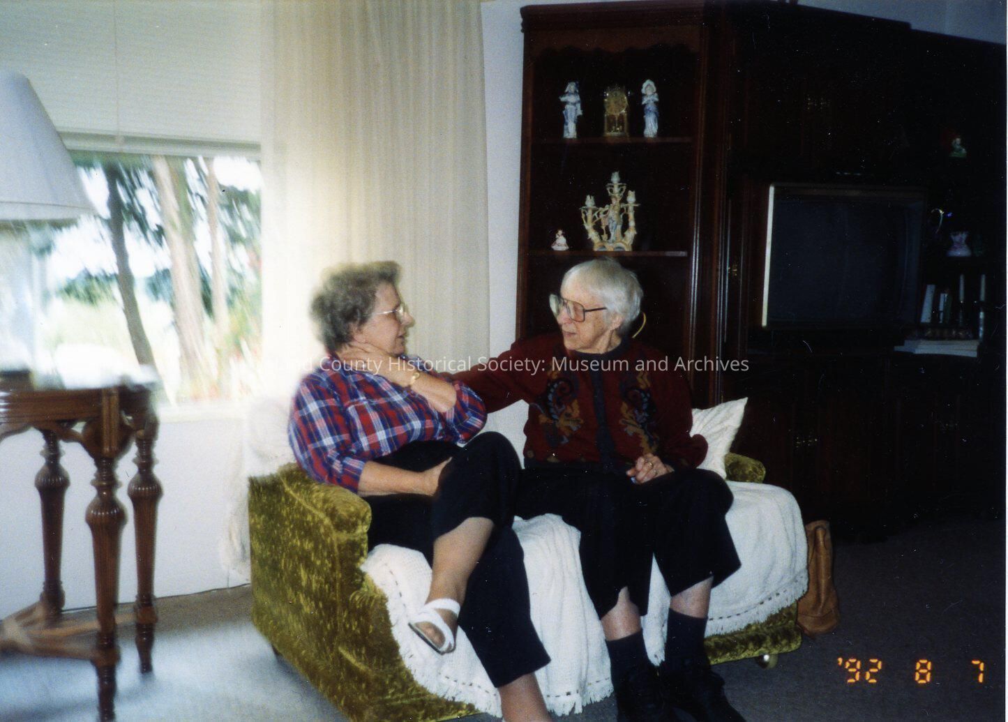 Color photograph of Murrieal Short and Mary Fullington taken 08/07/1992 in the living room of a house. Both women are seated on a loveseat covered with a white spread. Murrieal Short is seated on the left side facing Mary Fullington. She has grey hair and glasses and is wearing dark slacks and a red & blue checked blouse. Mary Fullington is seated on the right side. She has short white hair and glasses. She is wearing dark pants and a maroon sweater with parrots.