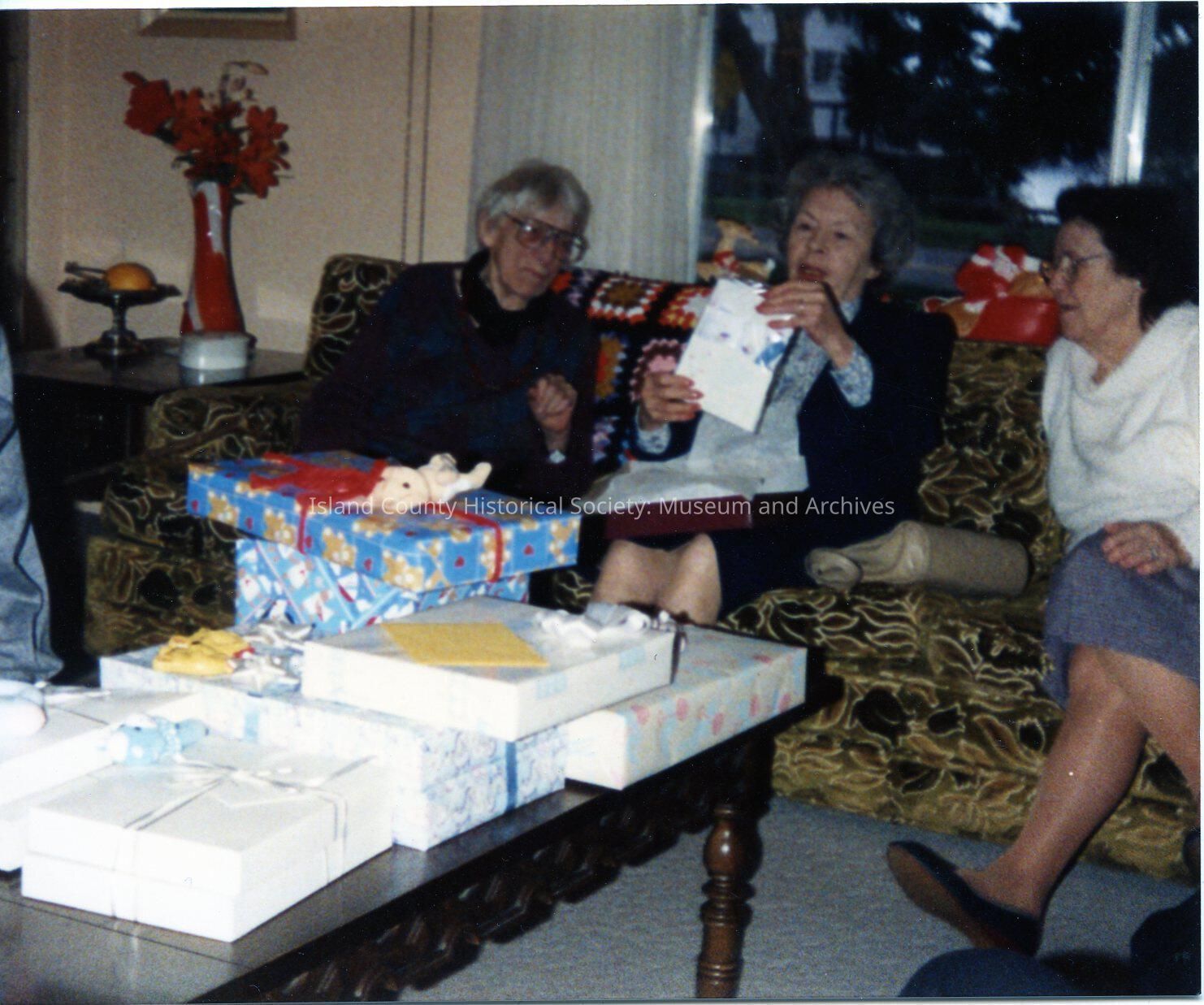 Color photograph of Mary Fullington and two unknown women. The women are seated on a tan brocade coach in a living room. There are wrapped presents on a coffee table in front of them. Mary Fullington is seated on the left side. She has short white hair and glasses. She is wearing a dark green & maroon sweater. The lady in the middle is opening a present. She has brown hair and is wearing a skirt, jacket and blue floral blouse. The woman on the right side has brown hair and glasses. She is wearing a tan skirt and a white sweater, Date unknown.
