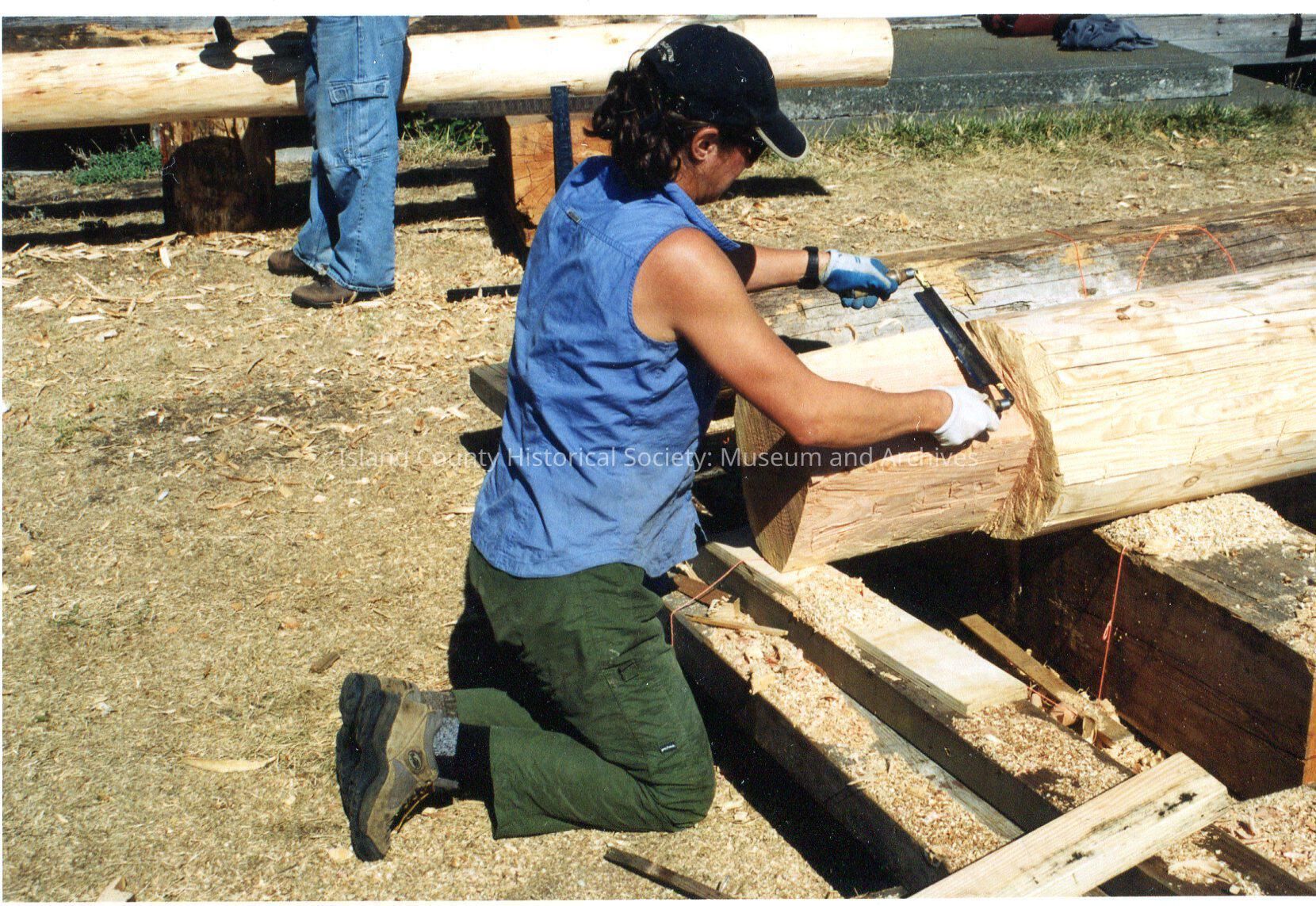 Jacob Ebey Blockhouse restoration in 2002 Man working on log, kneeling on the ground, shaving off wood