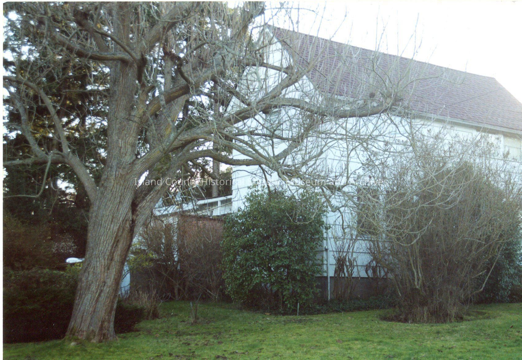 Carl Johnson house, side view mostly obscured by tree and bushes