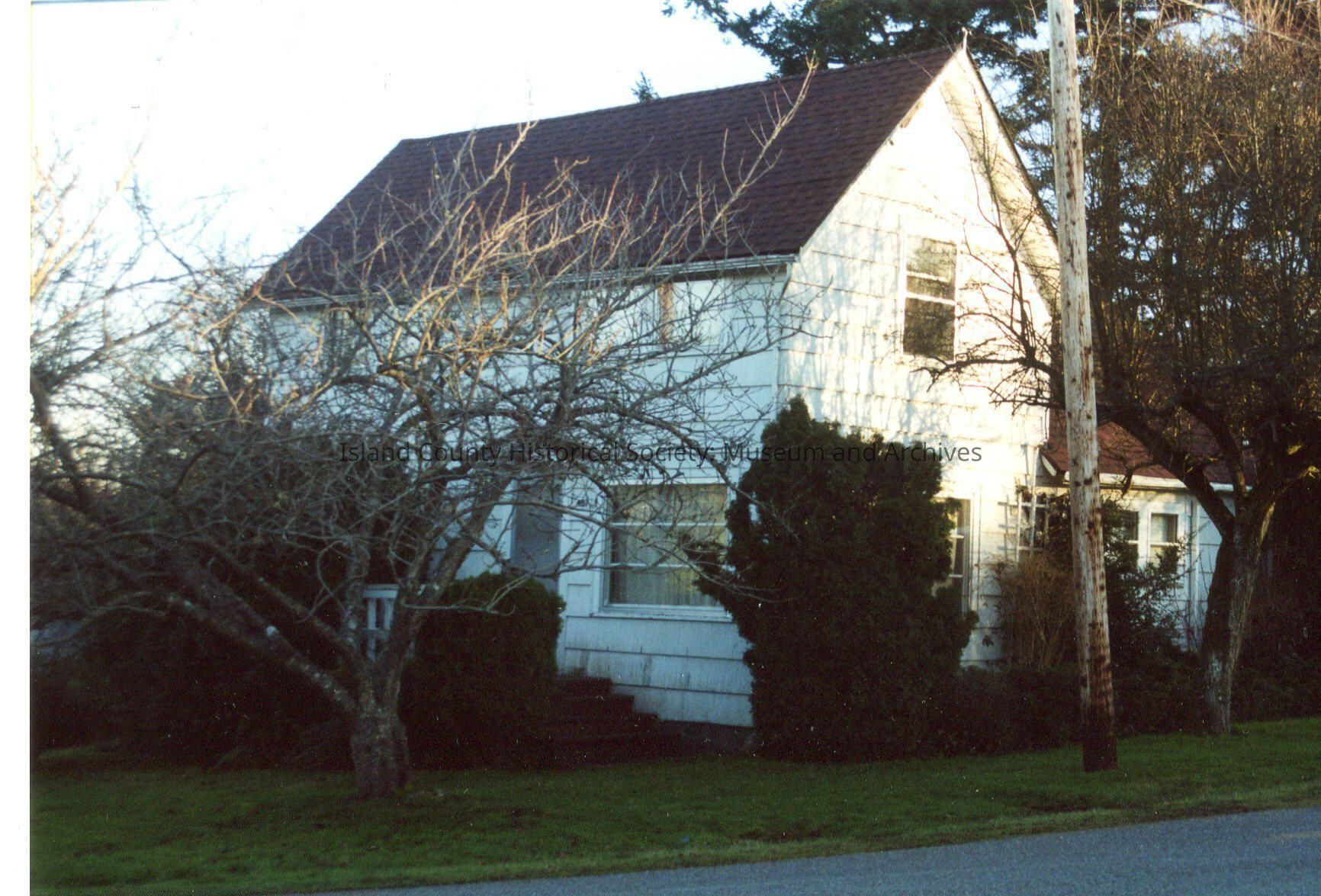 Carl Johnson house, front and side view mostly obscured by tree and bushes