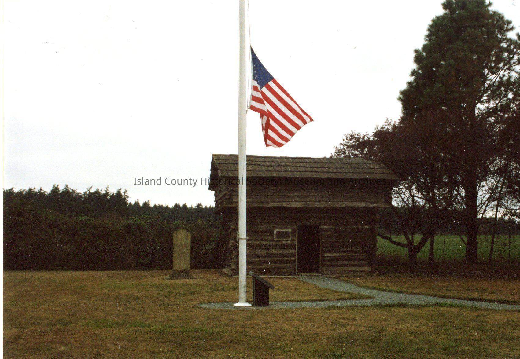 Davis blockhouse at Sunnyside cemetery with gravestone to the left of it and a flagpole with flag at half-mast in front. Trees and bushes on either side and prairie lands in the background.