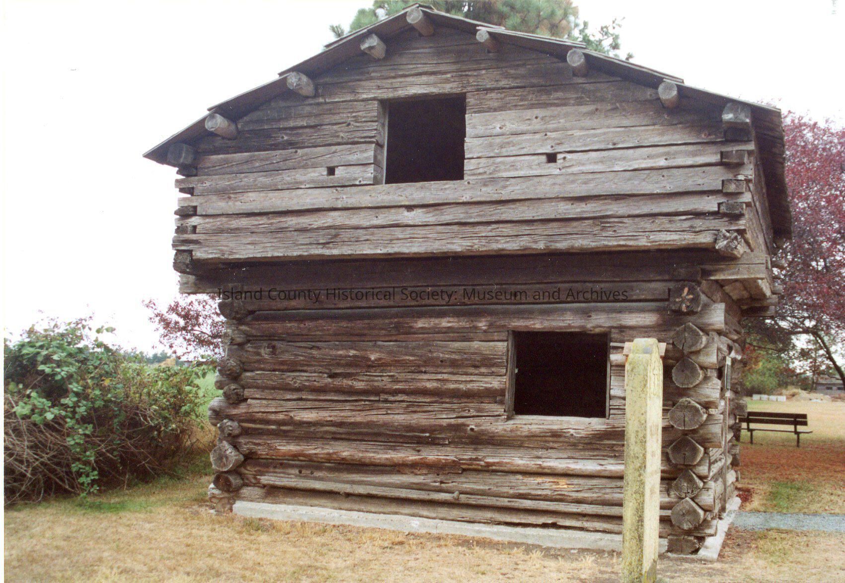 Side view of david blockhouse with side of gravestone in foreground. In the background is a bench, green field and tree with red-purple leaves. Came in envelope marked "9/01"- September 2001?