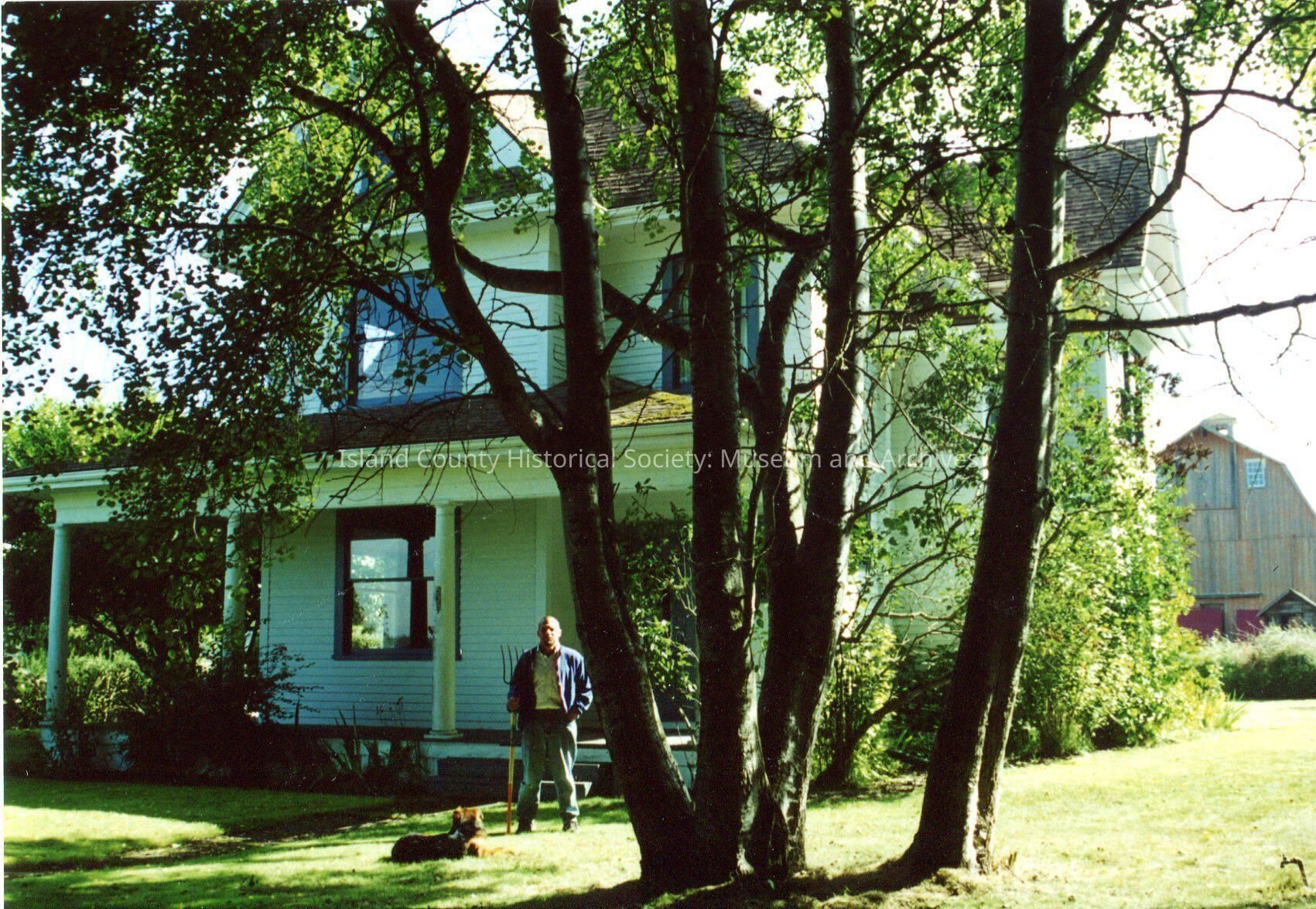 Jenne farm house front exterior with red barn in background (on right) and man standing astride holding pitchfork with dog seated in front of him. Trees obscure the view of the house.