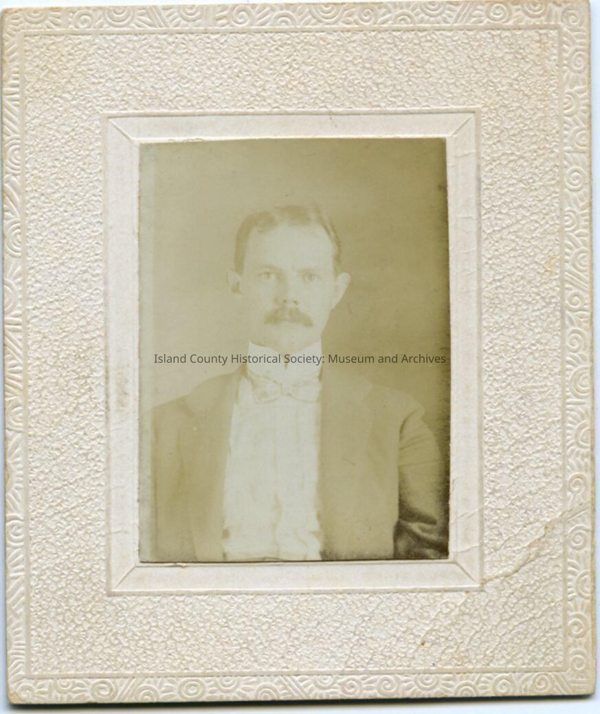 Photo of a man in a suit, with a high collar on his shirt, bow tie. His hair is parted in the middle and he has a mustache. The photo is in a cardboard frame. On the back: Dr. Joseph McKey. McKee. McKee, Joseph Dr., O.H.Made/Created