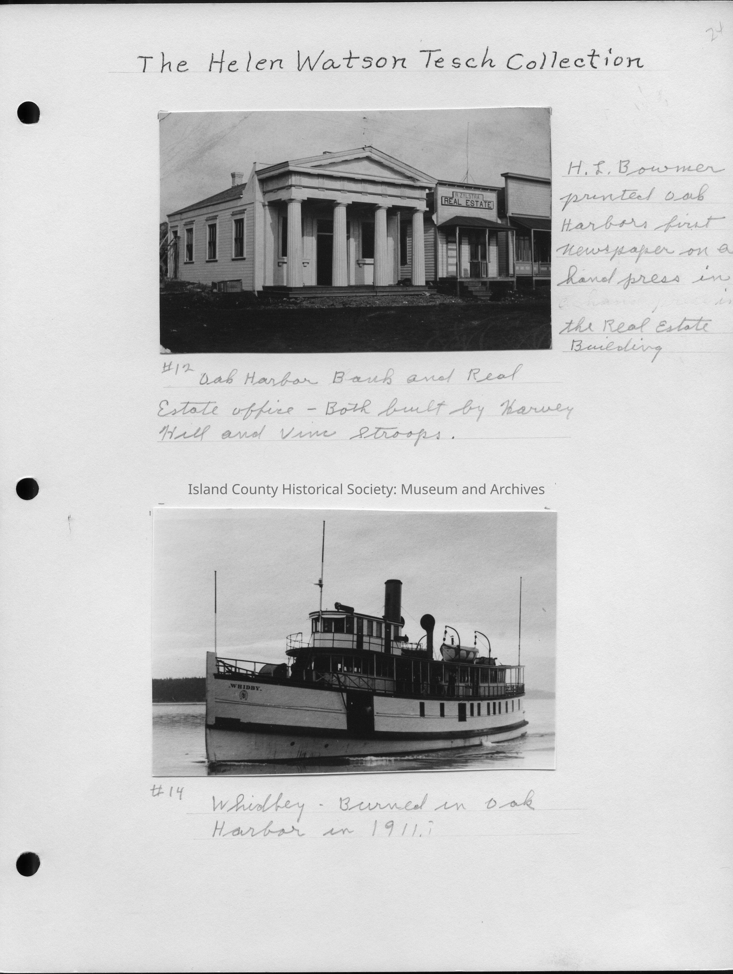 Top Photo - 4.5"W x 2.75"H - Photo of the Oak Harbor Bank and the R. Zylstra Real Estate office. Both were built by Harvey Hill and Vinc (sp.) Stroops. The words written next to the picture say, "H. L. Bowmer printed Oak Harbor's first newspaper on a hand press in the real estate building." No date.