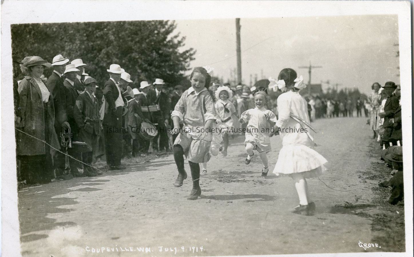 Postcard depicting 4th of July festivities in Coupeville, c. 1914. Four young girls seem to be running (perhaps skipping/jumping) towards a rope-line. Bystanders of all ages look on. Photo by Perry Grove.Collection