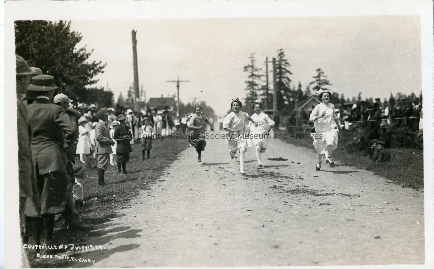 Postcard depicting 4th of July festivities in Coupeville, c. 1914. Four young girls seem to race toward a finish line (rope) while bystanders of all ages watch on. Photo by Perry Grove.