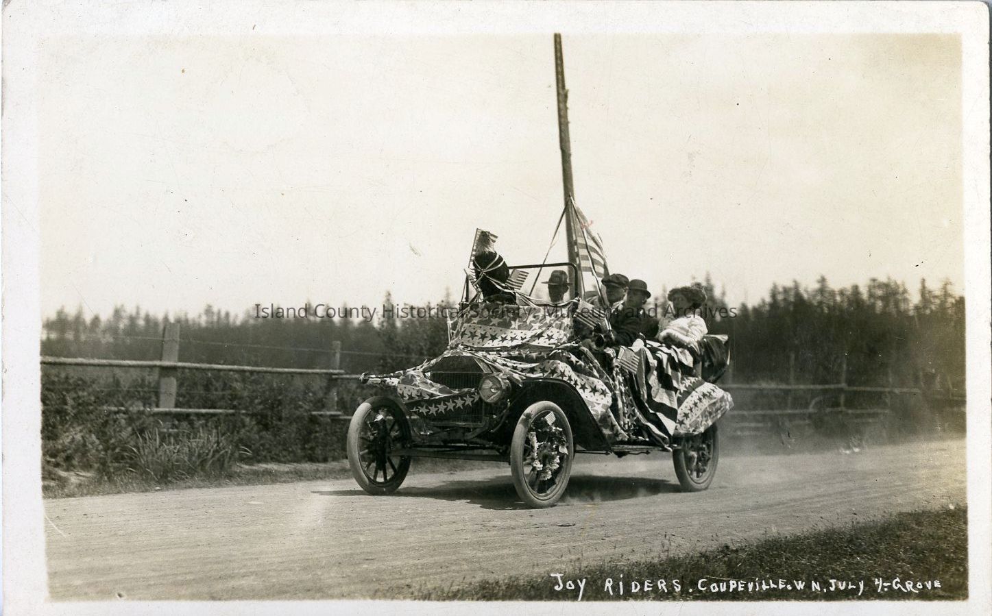 Postcard depicting "Joy Riders" on the 4th of July in Coupeville, c. 1914. Three men and one woman sit in a vehicle decorated in patriotic flags and fabric, with a bald eagle (statue) perched in the windshield. Photo by Perry Grove.Collection