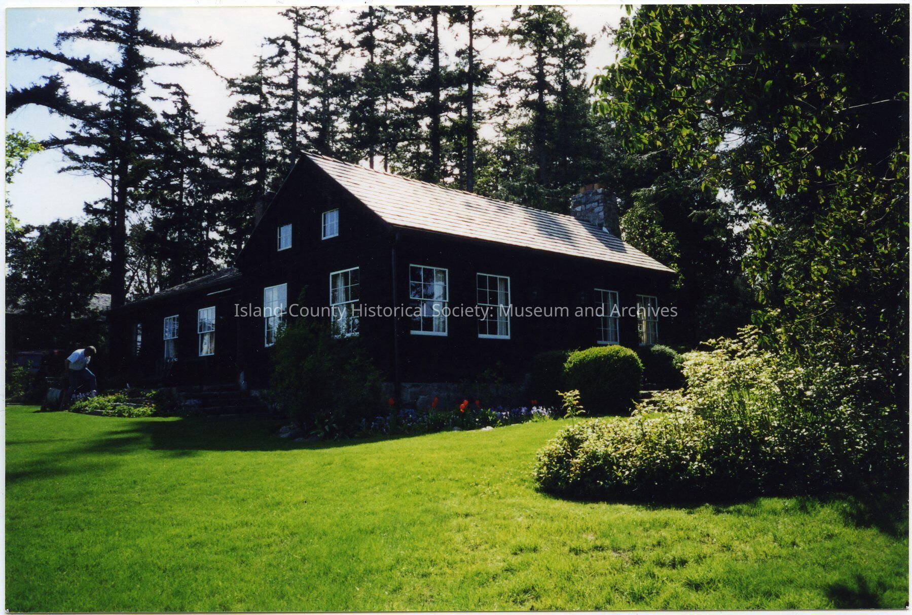 Photo of a house with four windows on the front - two either side of the door, two upstairs, and more along the long side. Stone chimney on the right. Trees, bushes and flowers. Person gardening on the left.