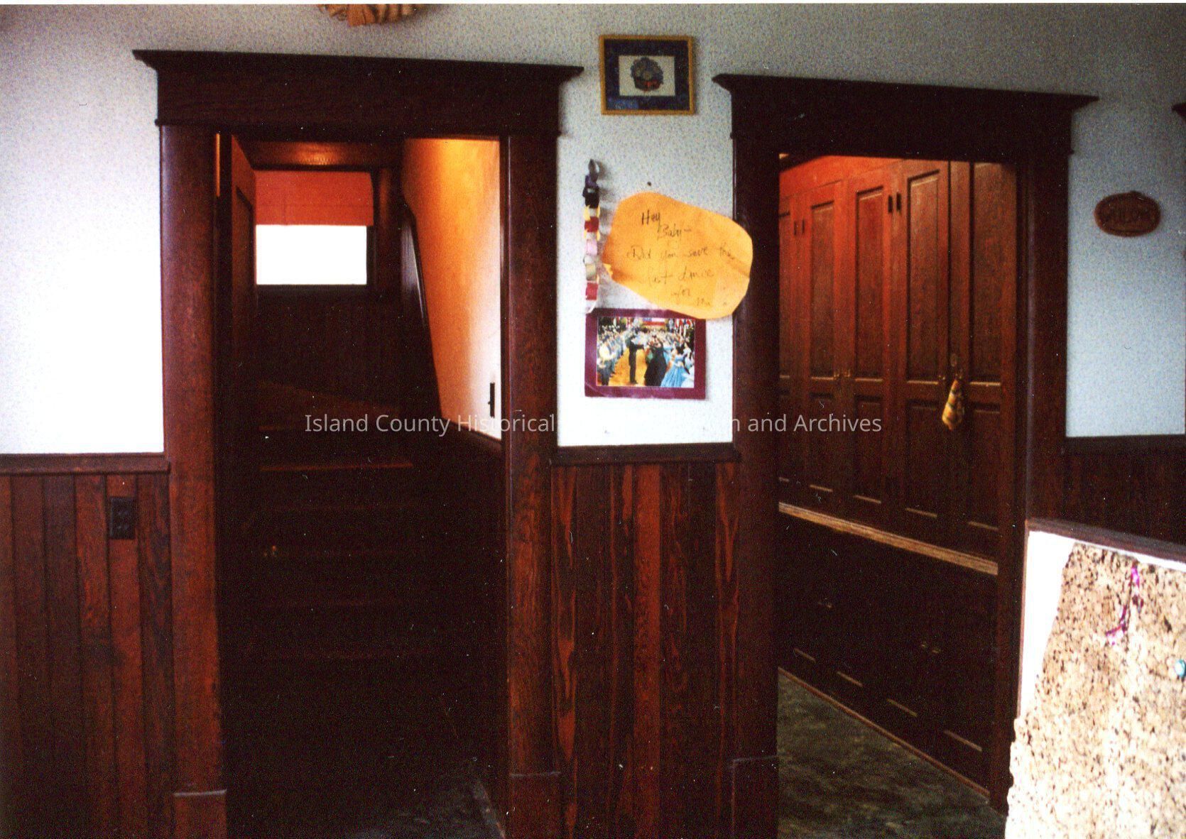 Jenne farmhouse February 2000- interior view of wall with two doorways to hallway and antechamber next to each other, decorations and pictures hanging on wall