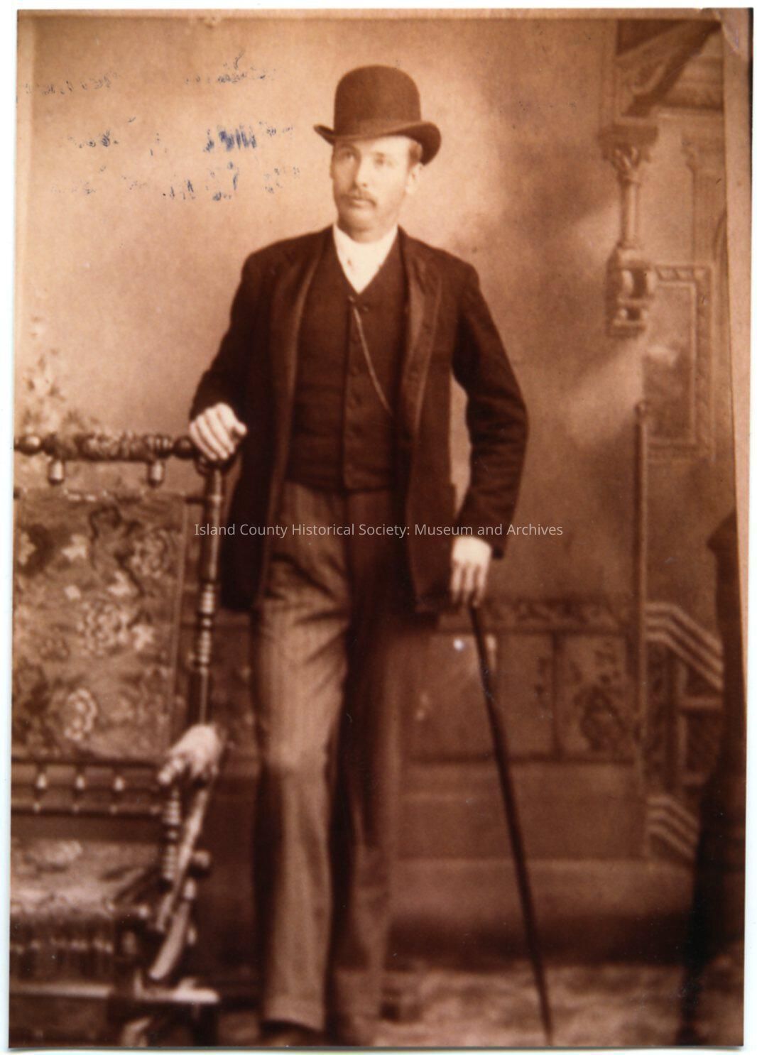 Photo of a man posed beside a tapestry chair. He is wearing a bowler hat, suit with vest, striped trousers, and is holding a cane in his left hand.