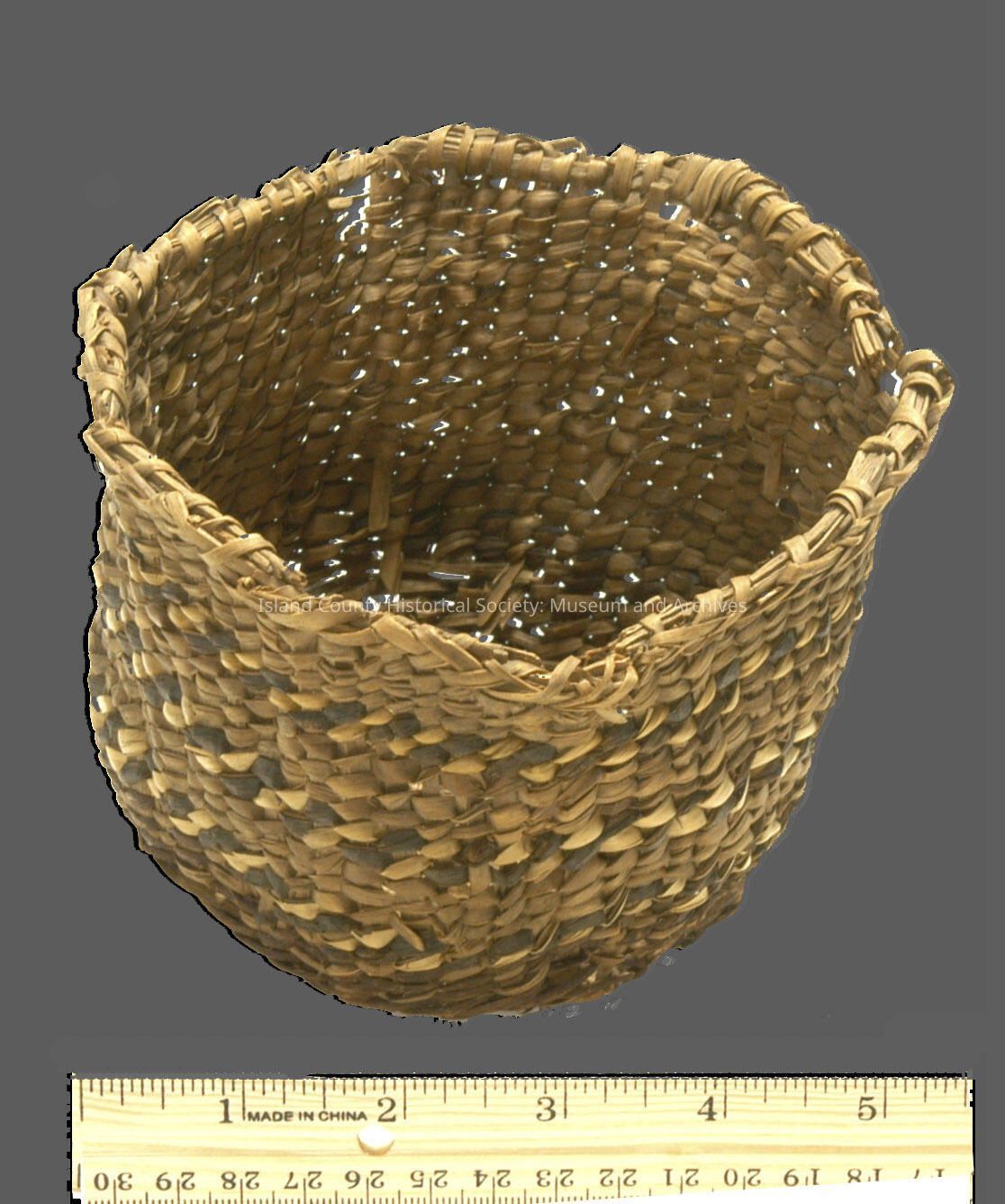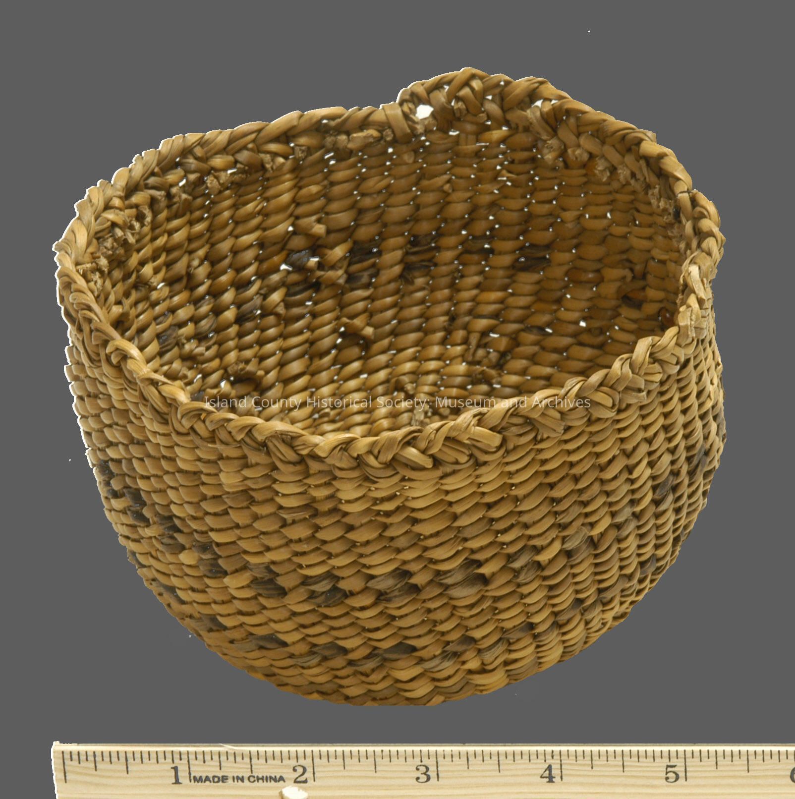 Baskets bought by Mrs. Deane Williams's father - Capt. Anderson - on the docks of Seattle. "Made by Puget Sound Indigenous People". Indigenous (Native American) made (items A-G). This basket was likely made exclusively to sell to tourists and other non Indigenous peoples.