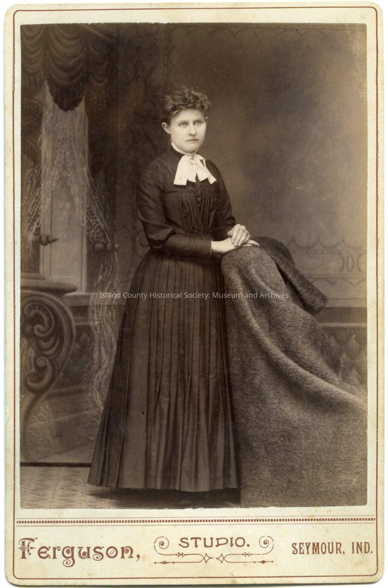 Photo of a woman in a long dress, pleated cravat/tie. She is leaning against a rug-covered chair. Studio portrait.