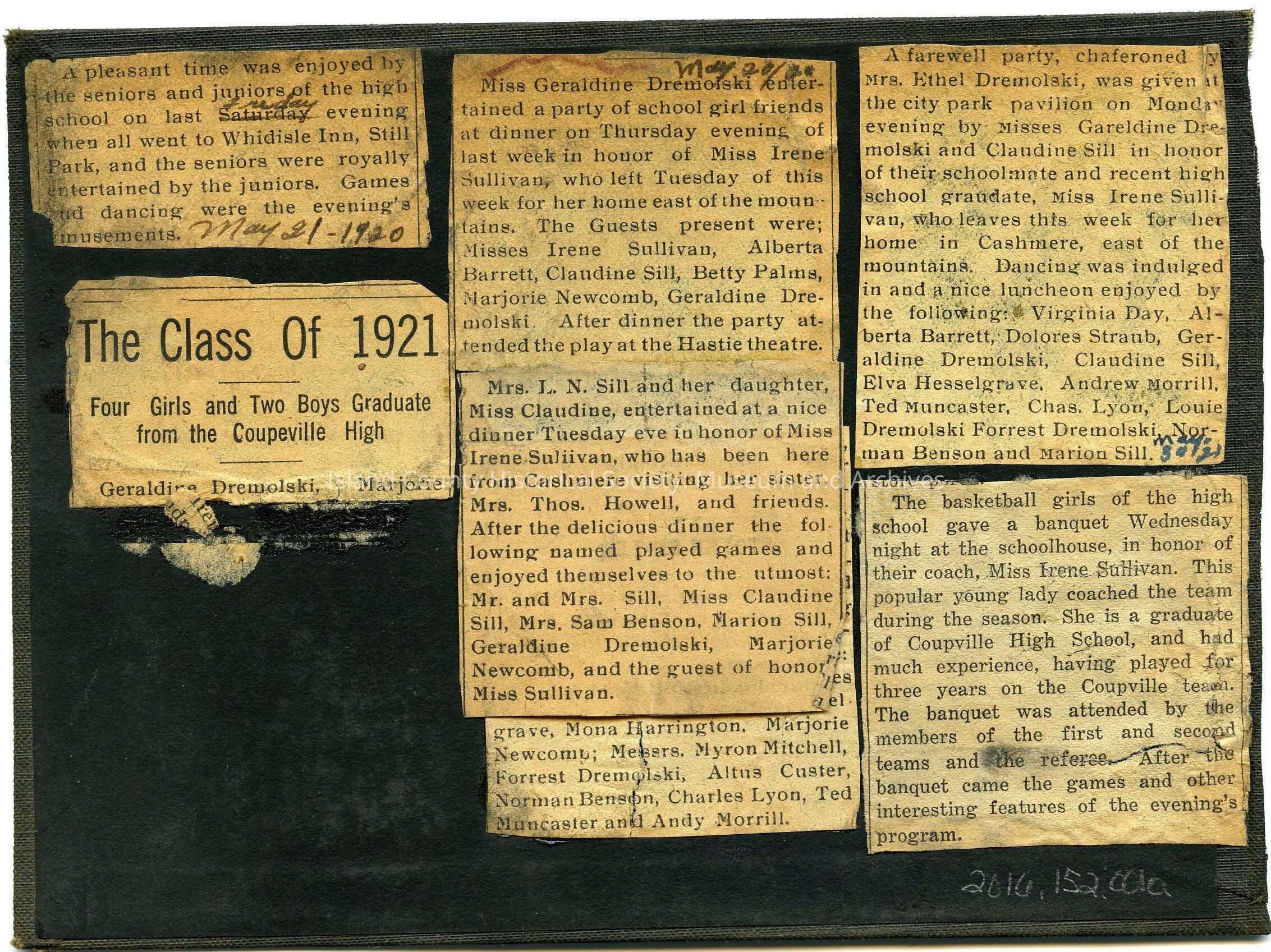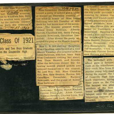 An article, split into seven different cut-outs, which pretains to the graduating class of 1921. The articles mainly refer to six gradutes of Coupeville High School and the parties that they held.
