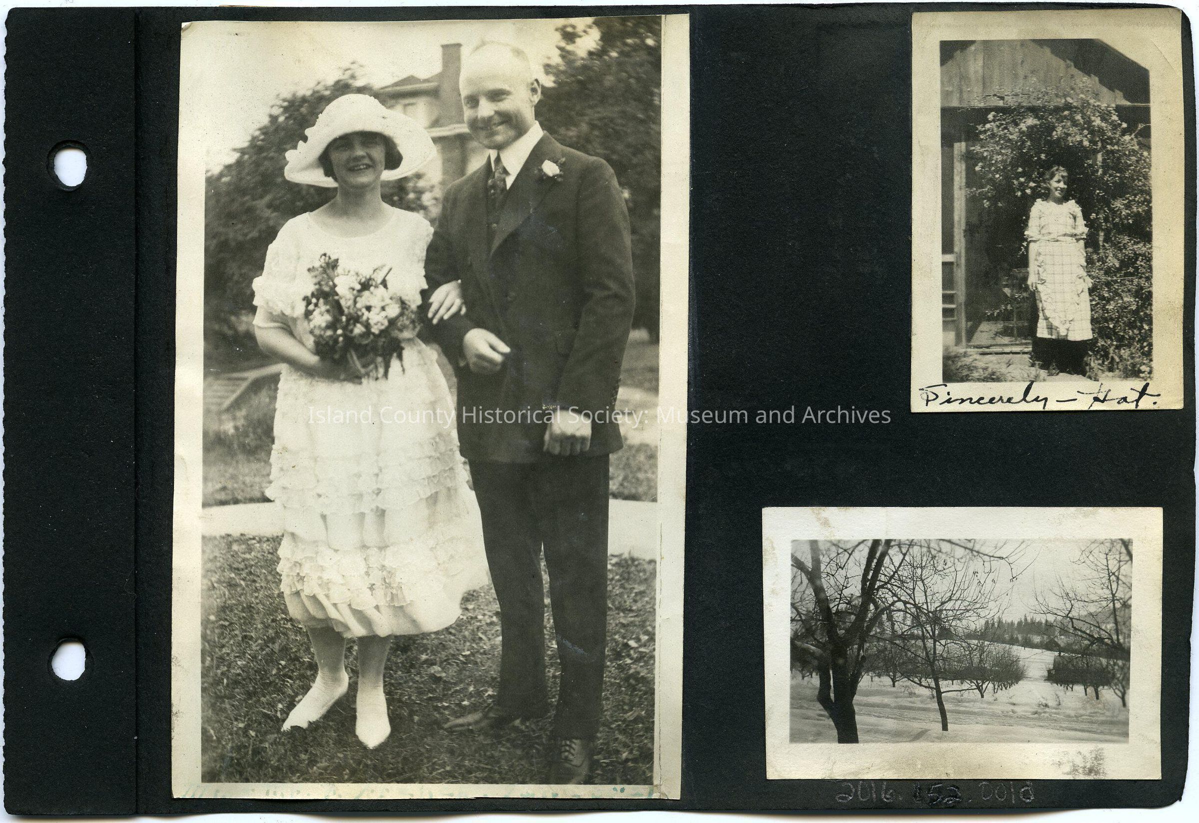 Left: A photo of a couple on what looks to be their wedding day. The woman is wearing a white, calf-length dress and a white hat. She is holding a bouquet of flowers. The man is wearing a dark-colored suit and tie. The couple's arms are linked. The photo was taken outside and there is a house or building in the background. There is writing on the bottom of the photo but it is too faded to read. 3.5"x5.5"
