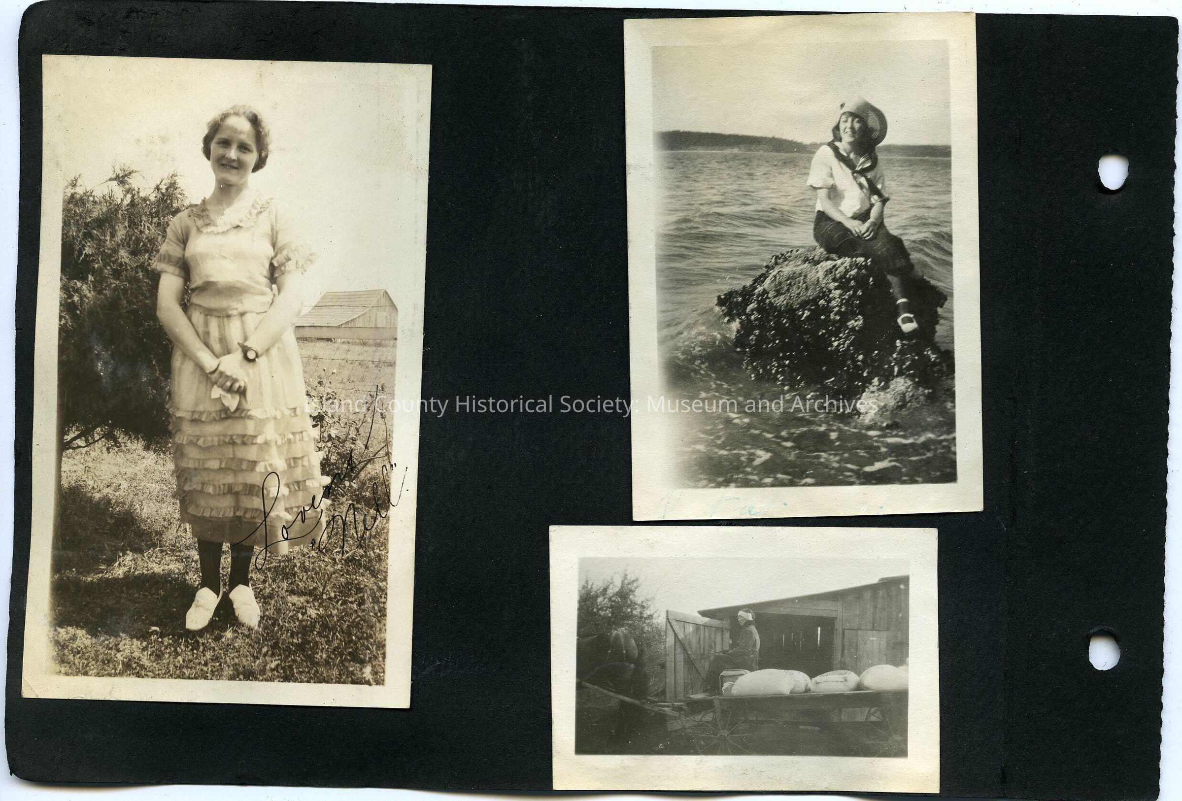 Top right: A small black and white photo of a woman standing outside with a flowering bush to her side and above her. The woman is wearing a plaid dress. There is a building behind the bush in the background. The bottom of the photo says, "Pincerely(?)--hat". 2"x2.5"