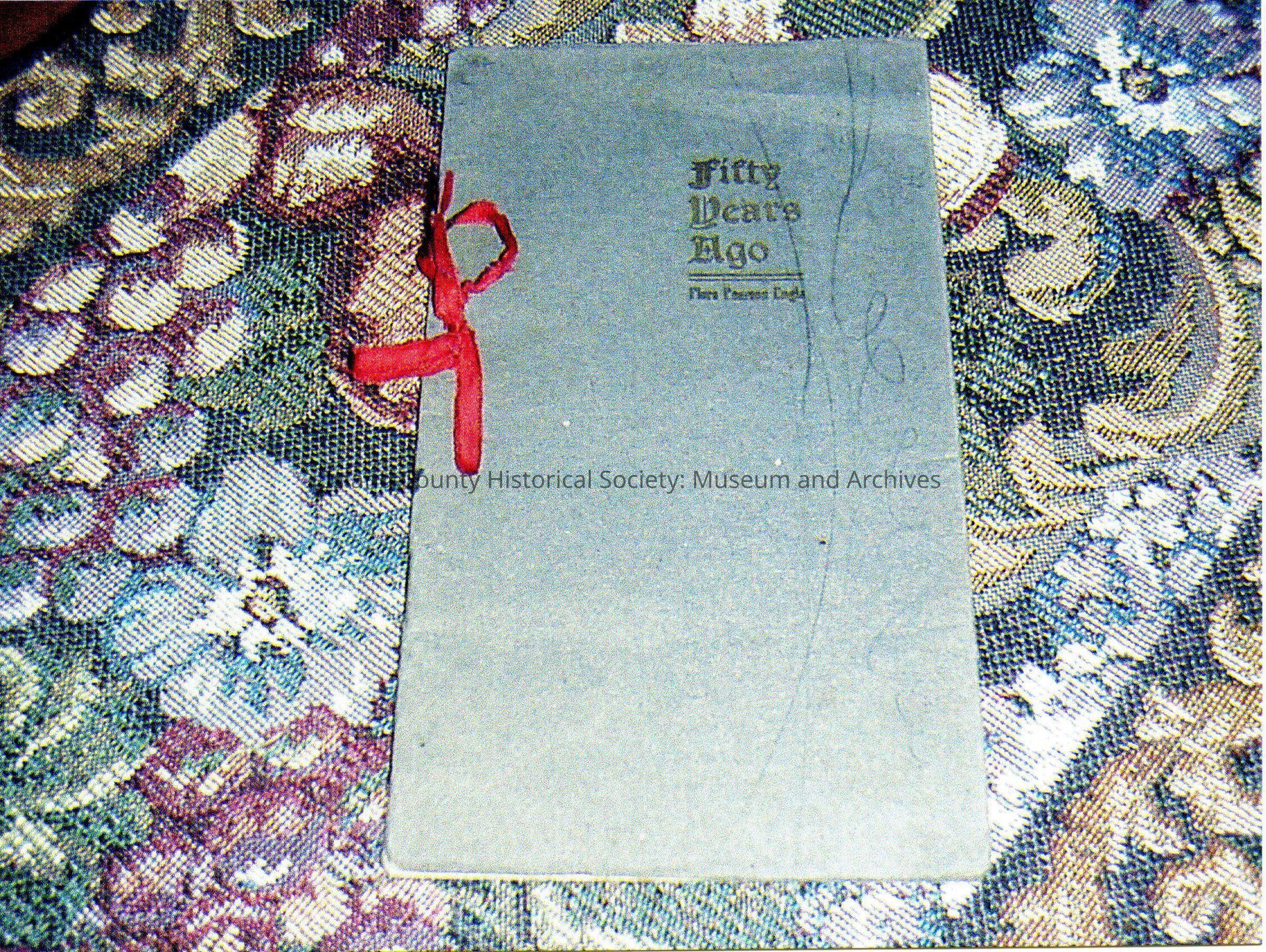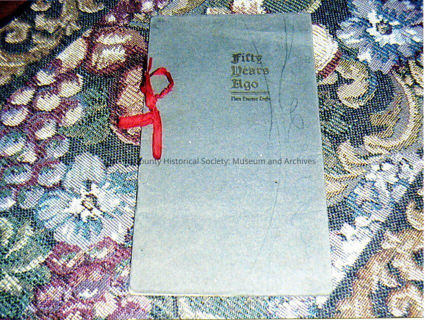A color photo of a book titled Fifty Years Ago with a red bow on the left side. It lays on a colored tablecloth (?). On the back is handwritten note "Photo of one of the original copy of Fifty Years Ago by Flora A.P. Engle. Written in 1916 or 1917. Flora arrived on Whidbey in early 1866. Given to my father, Will Engle by his grandmother. Joanne Engle Brown.