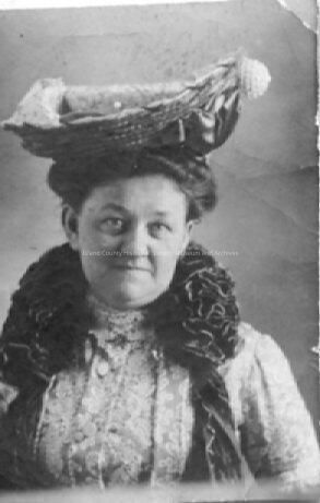 Stamp-sized picture of Mrs. Albert Kineth wearing a large ruffled collar and a big hat.