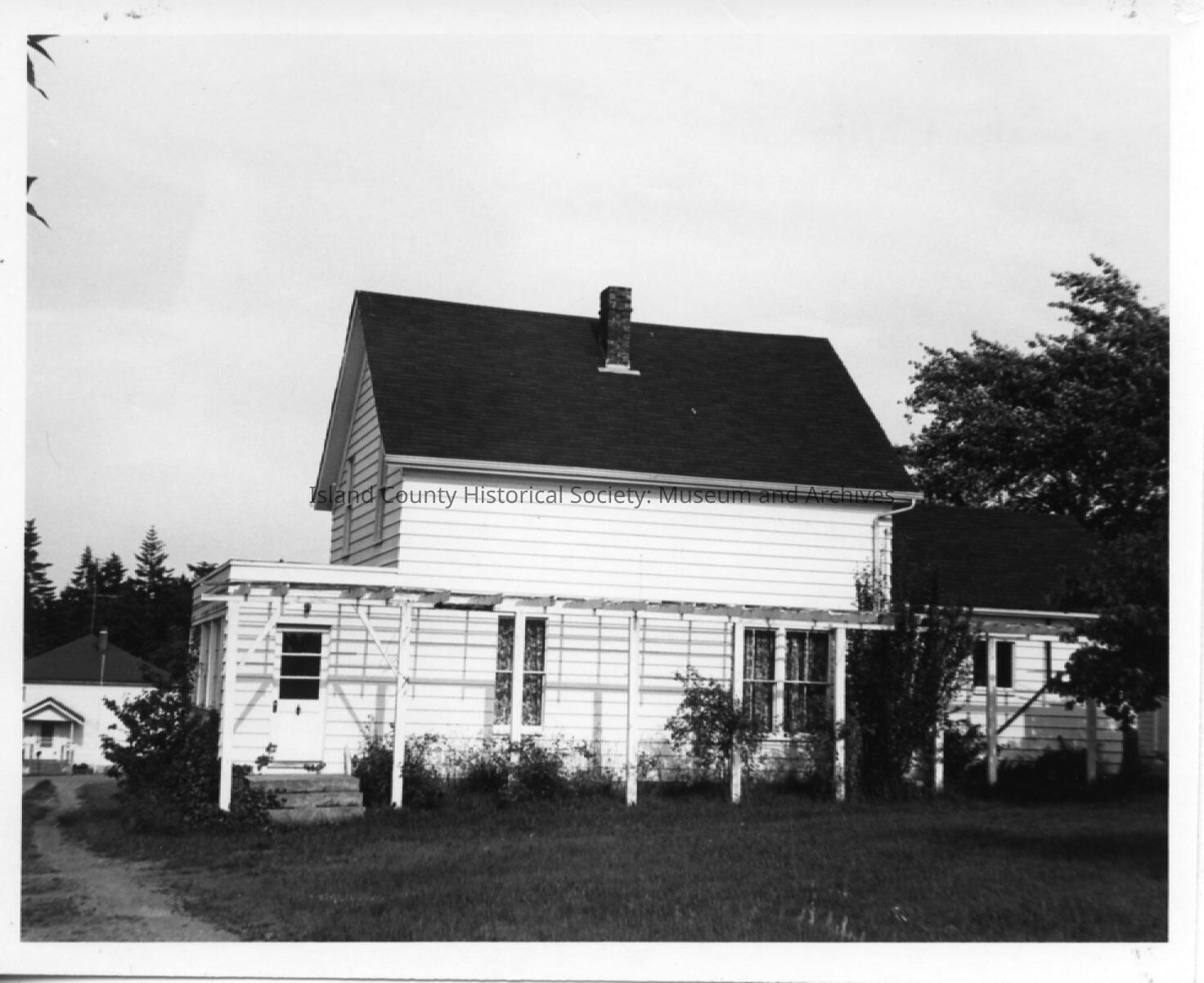 Albert R. Kineth (1885) house side view before remodel. House is white with flat roof above door. Chimney emerges from middle of roof.