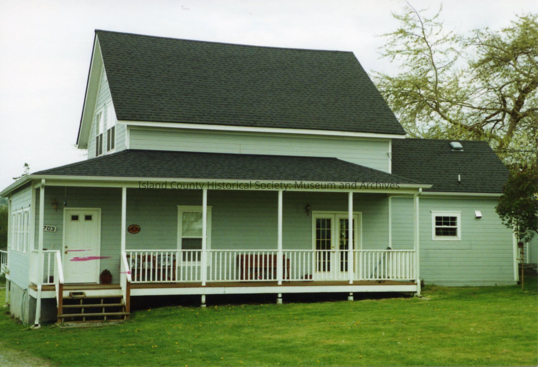 Albert R. Kineth (1885) house side view after remodel. House is green with porch. Front door and french doors open to porch. Chimney has been removed.
