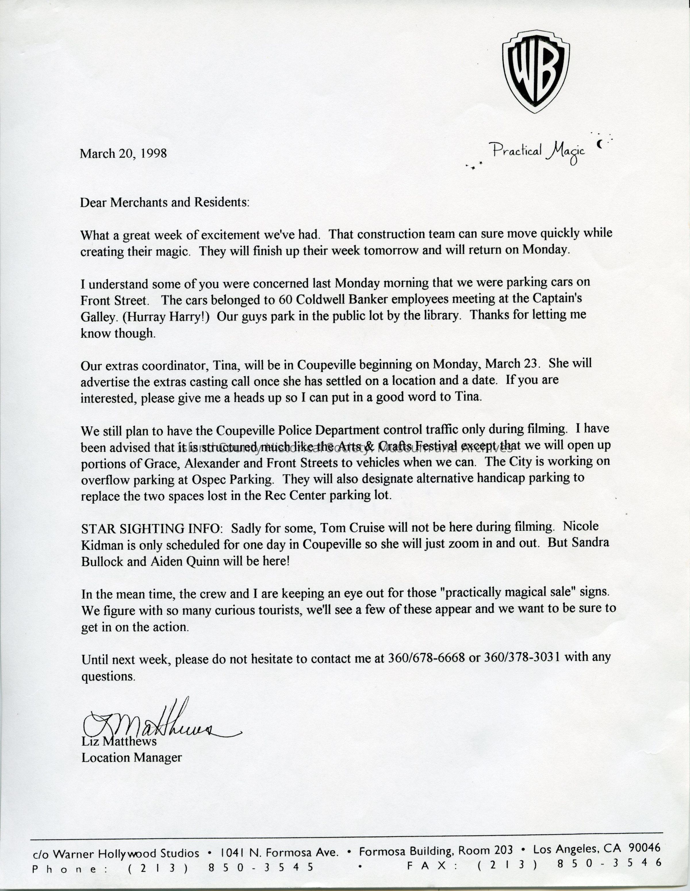 A letter from Practical Magic Location Manager, Liz Matthews, to merchants and residents of Coupeville about the parking situation while filming Practical Magic