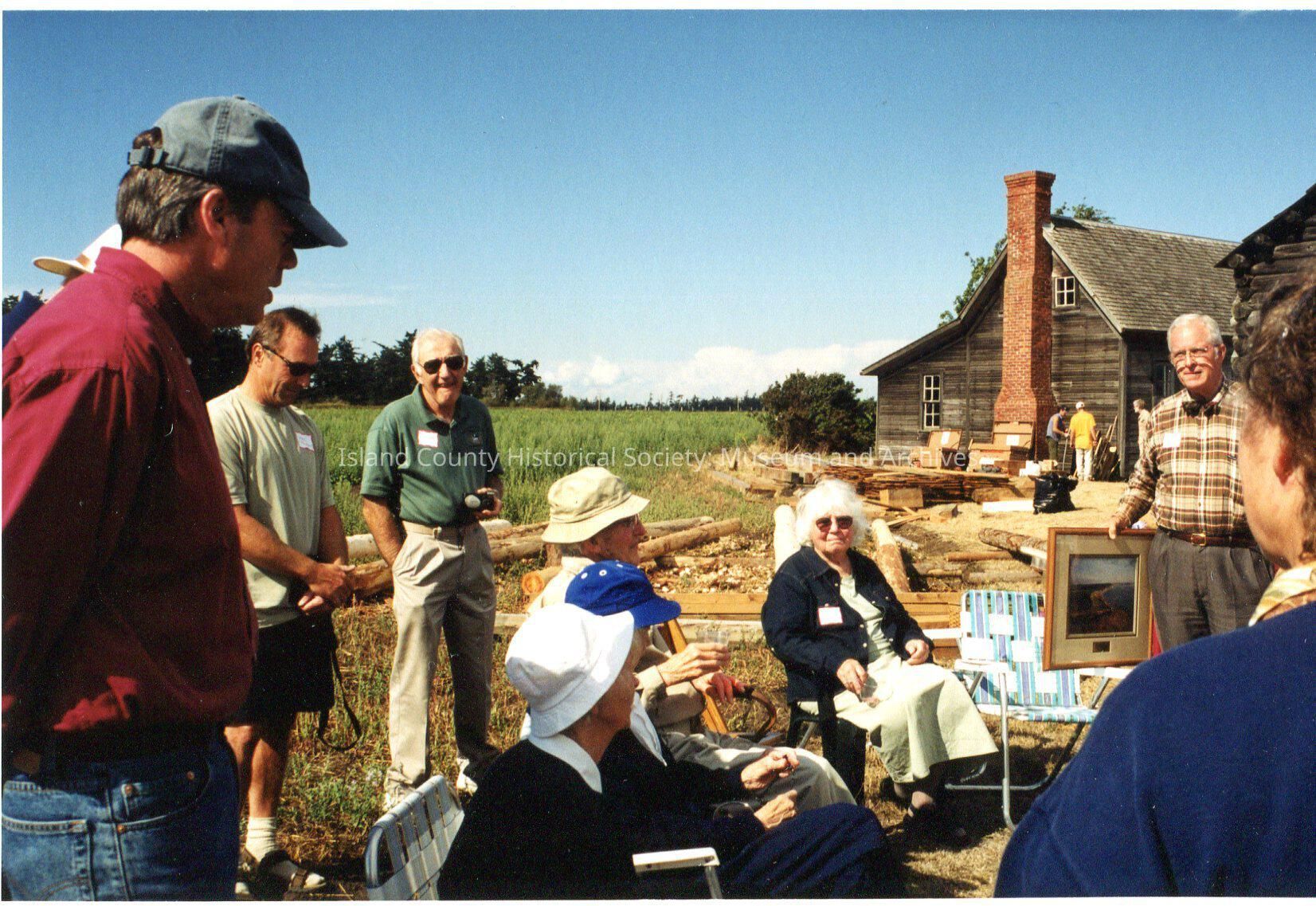 Albert Heath is seated along with three ladies. A few men stand behind them, Ken Pickard in beige and Al Sherman in forest green. Man in plaid shirt and brown trousers holds out a framed picture (a photograph most likely), standing before this little crowd. Logs, planks of wood, Ebey's house and blockhouse in the background.Lexicon